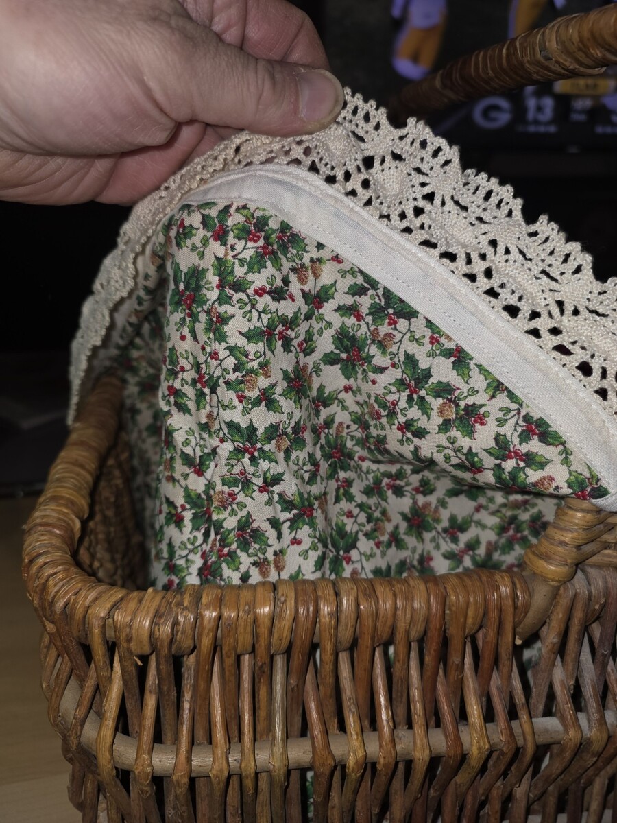 Holiday Heavy Wicker Basket with Removable Reversible Red Fabric Liner Holly