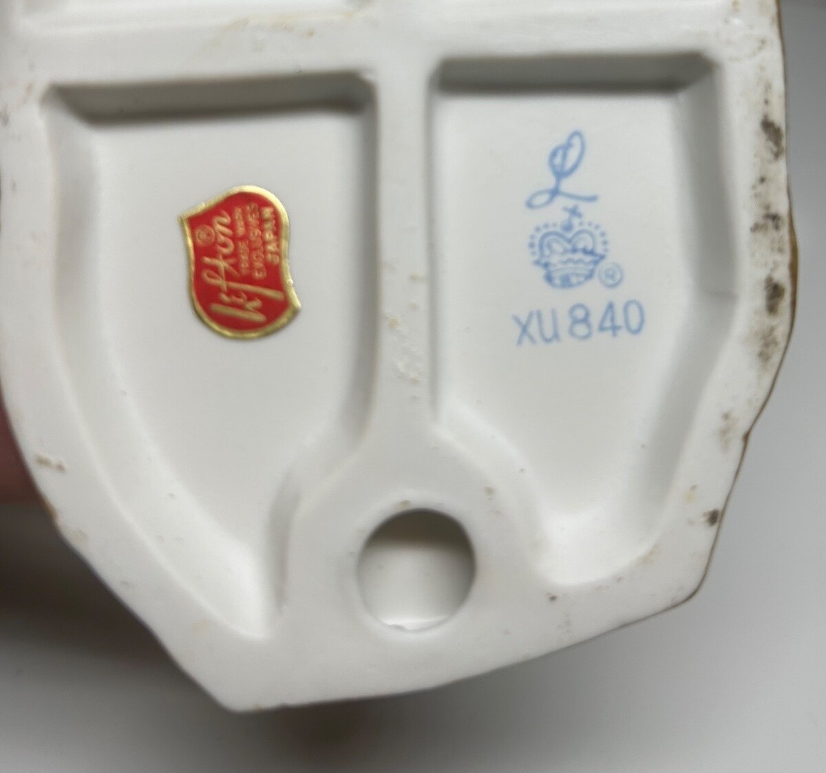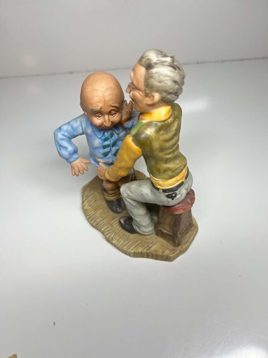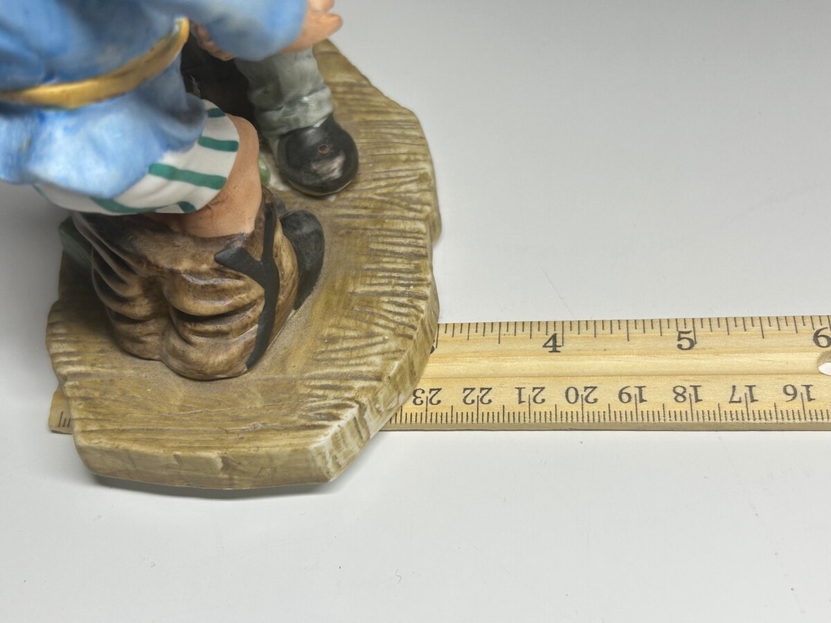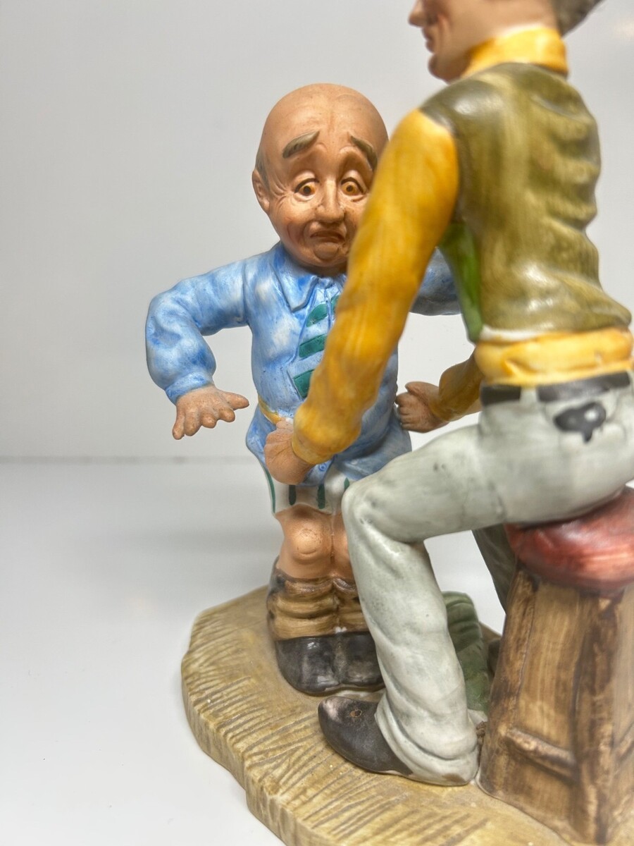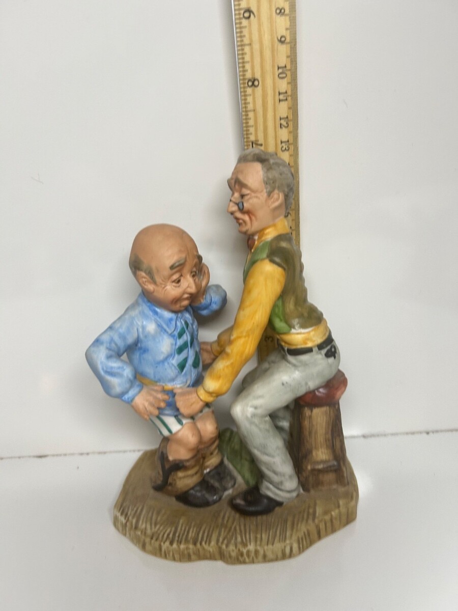 This humorous porcelain figurine was produced by the Lefton company of Japan, likely during the 1950s to 1960s. It depicts a comical scene of a tailor measuring a customer who has his pants down, capturing a moment of everyday life with exaggerated expressions and postures. Perfect for home decor or as a gift for collectors