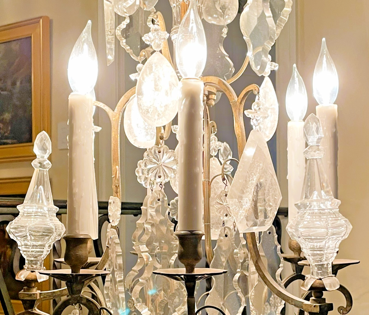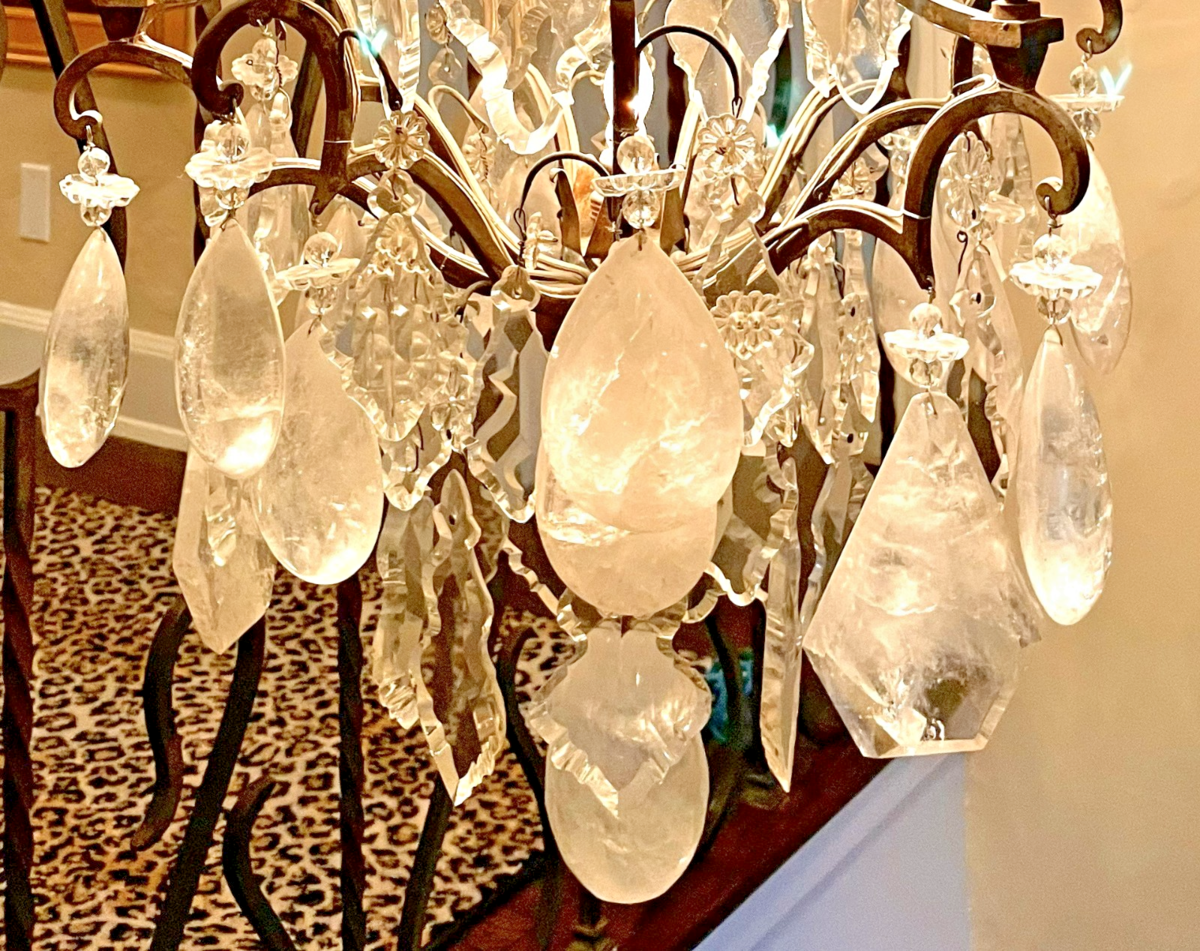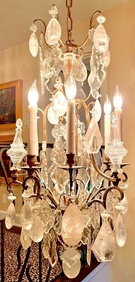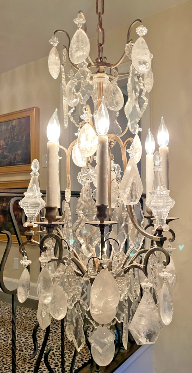 The gilt-bronze cage chandelier has 6 lights, 4 hollow crystal finials or spikes, clear cut crystals and quartz rock crystals each with a rosette crystal above them and the bottom crystal is egg shaped. It features a tiered silhouette.