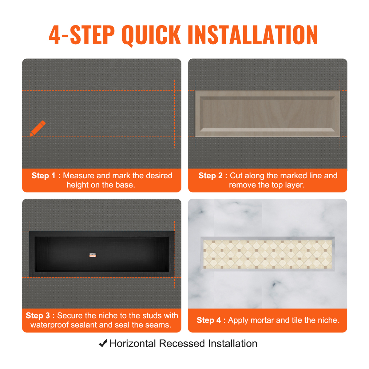Easy Installation: Equipped with a complimentary installation kit, horizontal embedded installation, you only need to follow the following steps to complete. These shower niche shelves can be installed without complicated procedures.