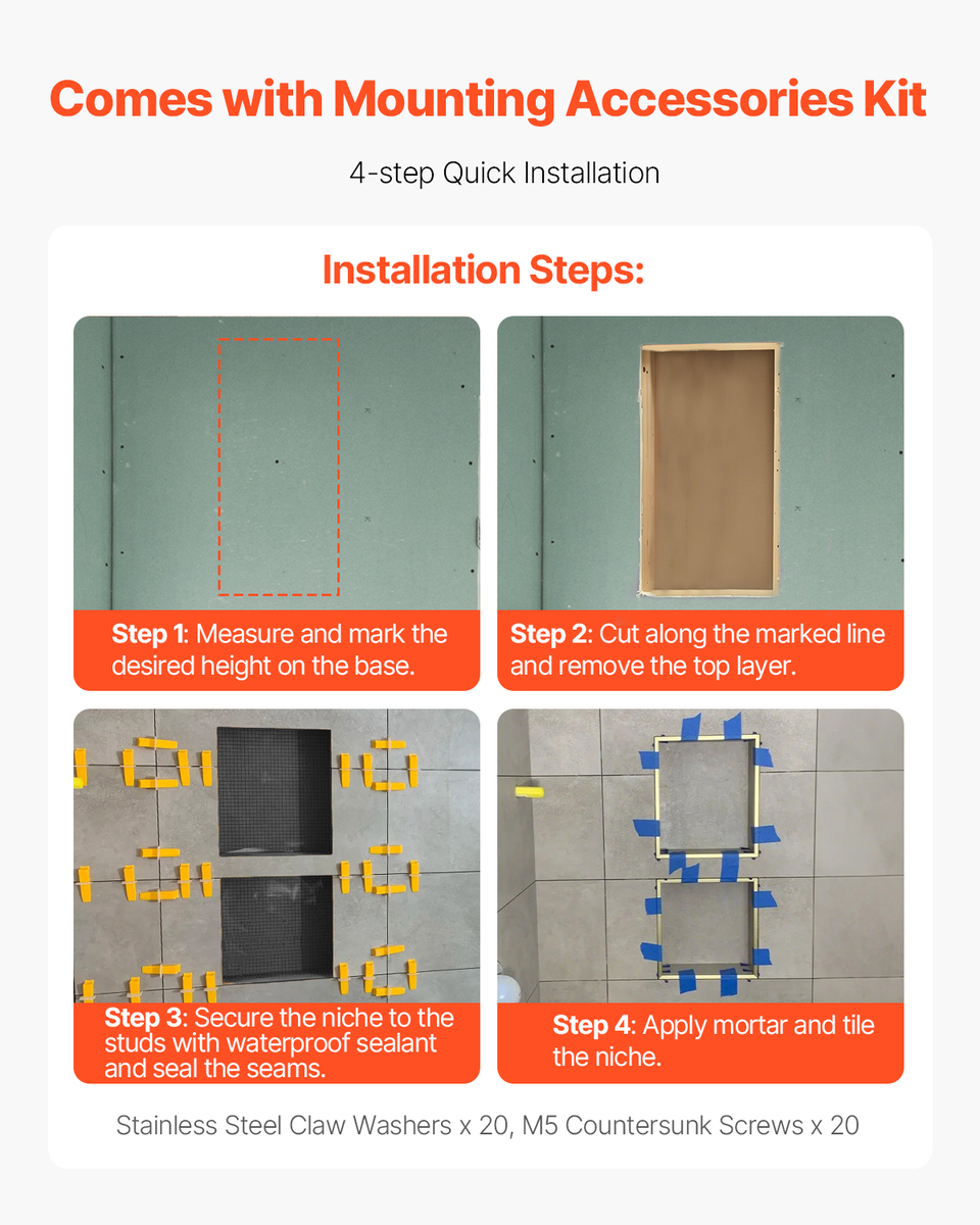 Easy Installation: Comes with an accessory kit for horizontal or vertical recessed installation. Just follow these steps: Step 1: Determine the required height and draw a horizontal line on the base layer. Step 2: Cut along the line and get rid of the top base layer. Step 3: Use waterproof sealant to attach the niche to the studs and seal the joints. Step 4: Apply mortar and affix chosen tiles.