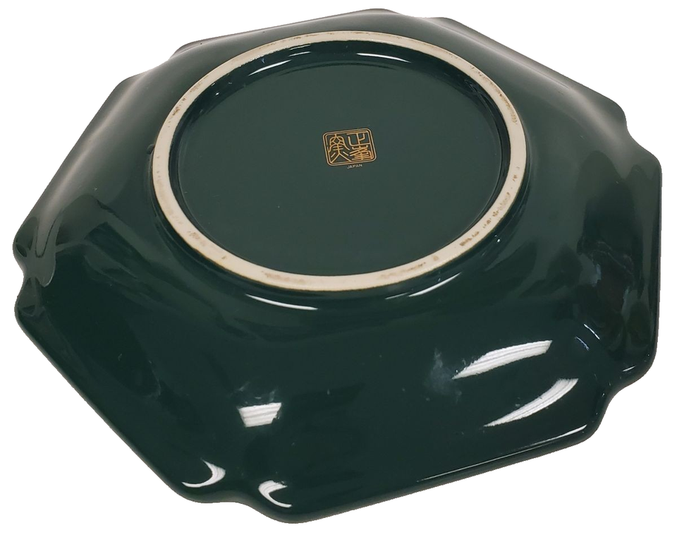 This stunning vintage Otagiri Jade Kiku Japan hexagonal serving dish captures the grace and refinement of traditional Japanese porcelain. Adorned with a luminous green enamel glaze, delicate hand-painted floral and butterfly motifs, and a shimmering gold trim, it?s both elegant and timeless.