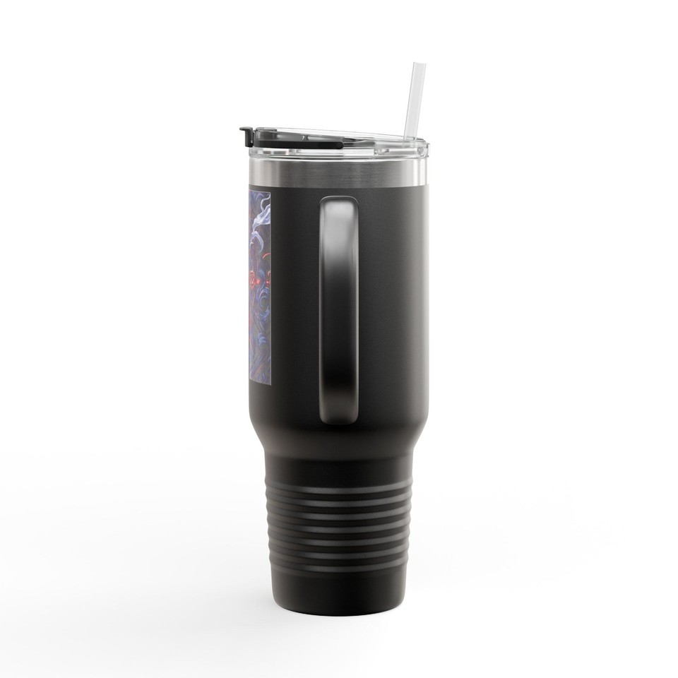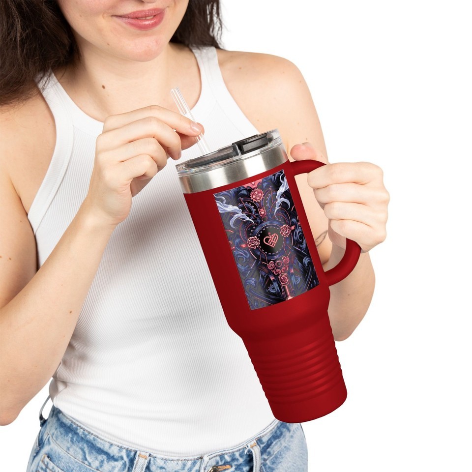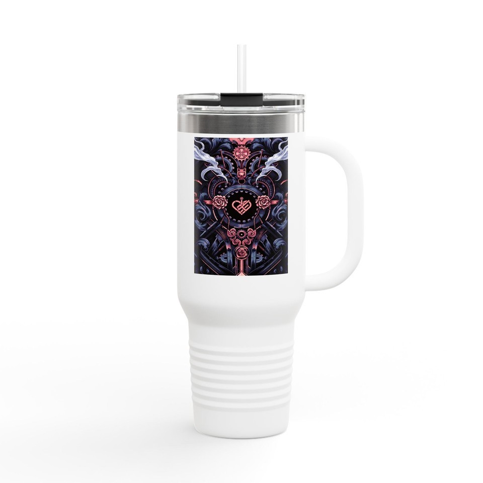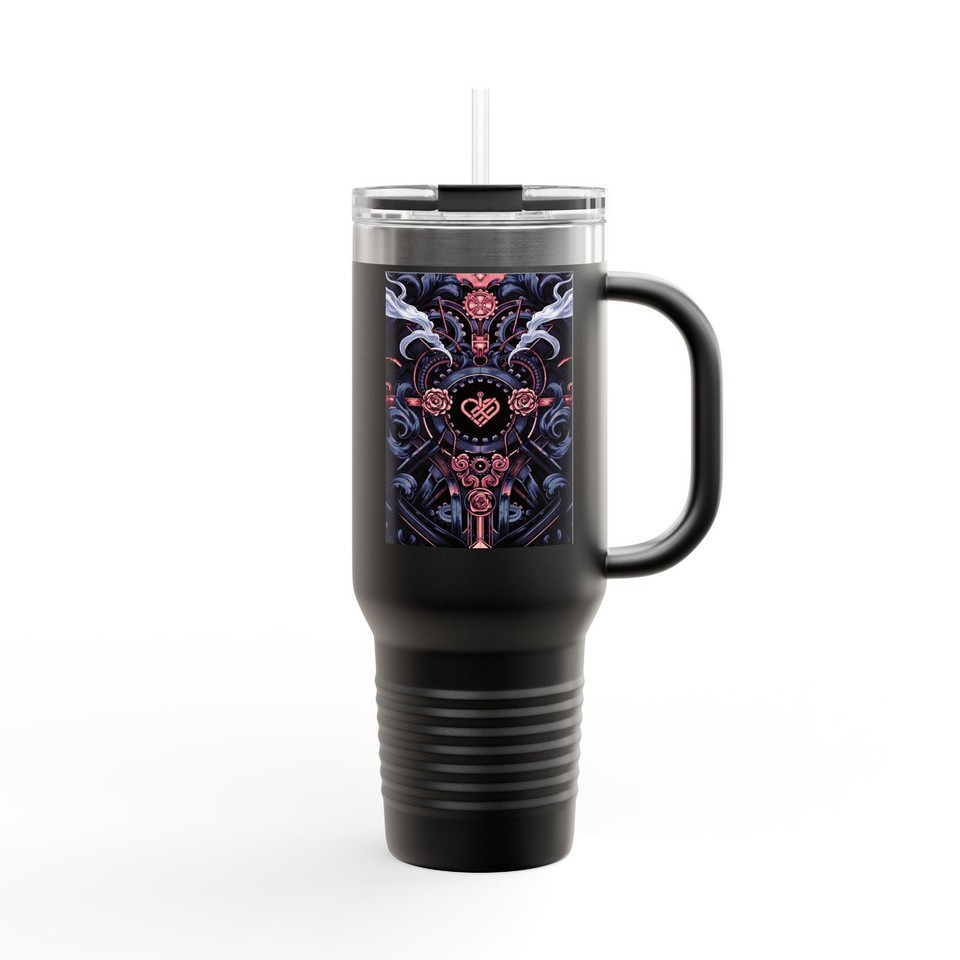 A 40oz insulated travel mug built for long days on the road and early-morning routines. Thick double-wall stainless steel locks in temperature so coffee stays hot and iced drinks stay chilled for hours. The ergonomic handle and included straw make sipping comfortable whether you?re driving, working at a desk, or sitting around a campfire. Powder-coated finish gives a soft, grippable feel and resists scratches, while the leak-resistant push-on lid with secure latch keeps spills away. The printed panel shows an intricate, moody design that adds personality without being loud ? a quiet companion for commuters, creatives, and anyone who prefers a practical tumbler with artistic flair. BPA-free and available in several colorways, this mug is built to be used daily; hand wash recommended to preserve print and finish.