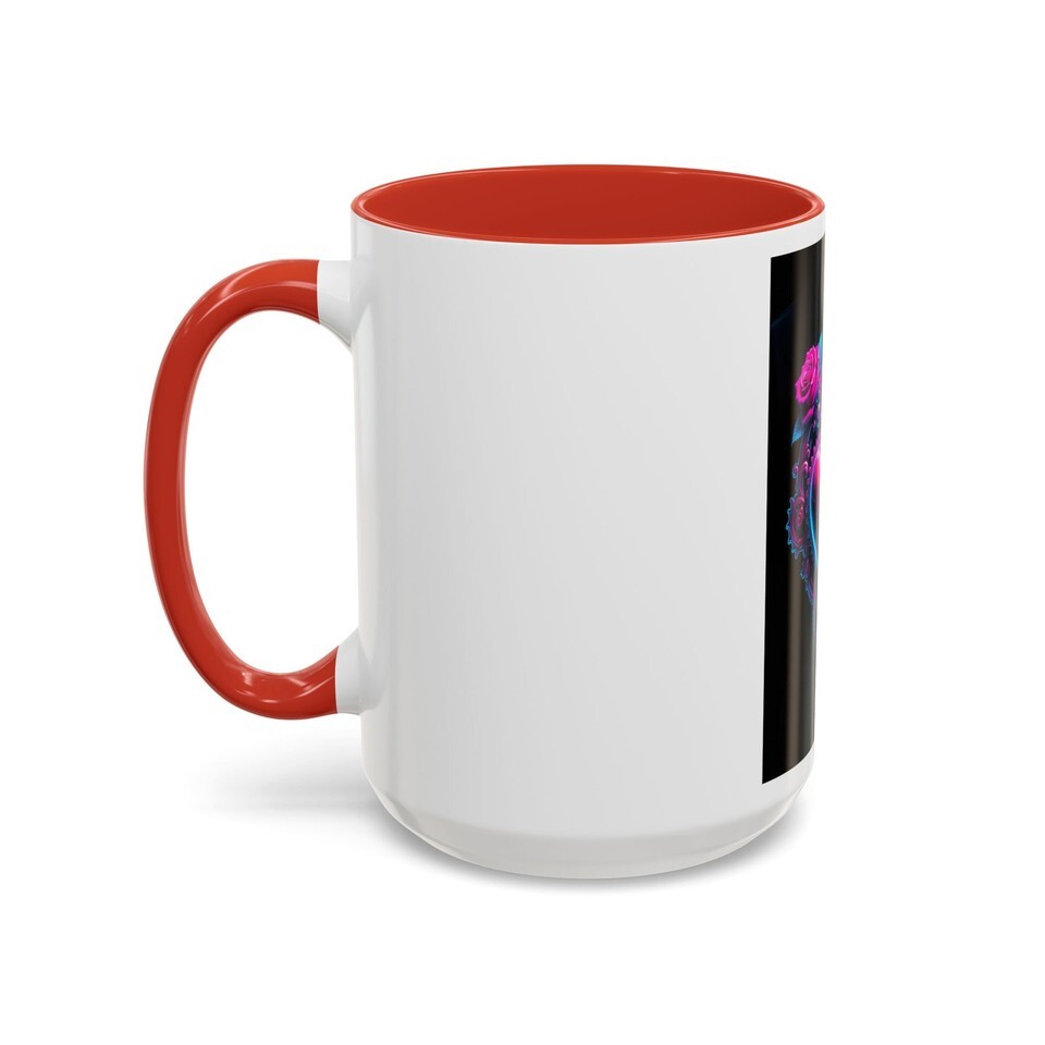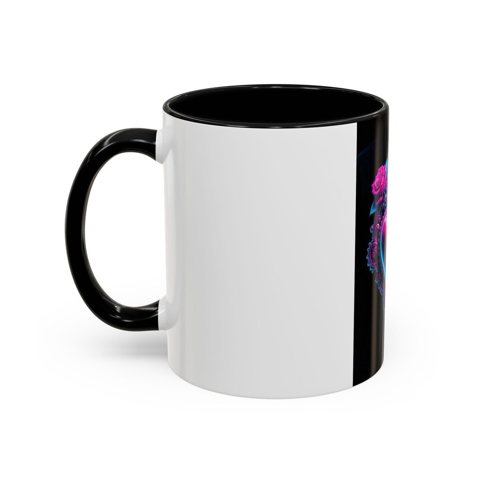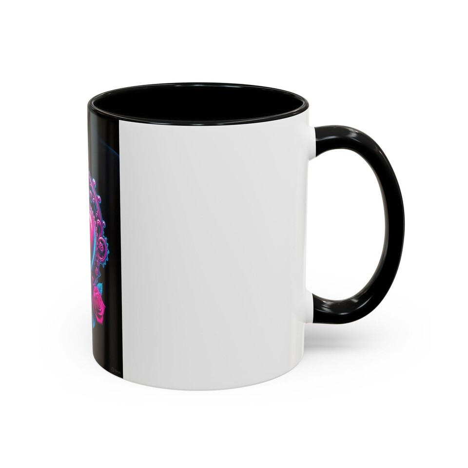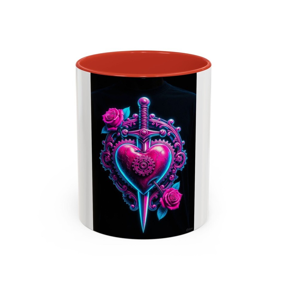 This ceramic accent mug brings bold, neon romance to your daily ritual. A jewel-toned heart pierced by a filigreed dagger sits against a deep black background, framed by delicate roses and gear-like details ? part tattoo flash, part cyberpunk romance. The glossy finish and high-contrast interior color make the artwork pop, turning a simple coffee break into a moment of attitude and color. It?s made to live on your desk or kitchen shelf, ready to brighten slow mornings or late-night creative sessions.