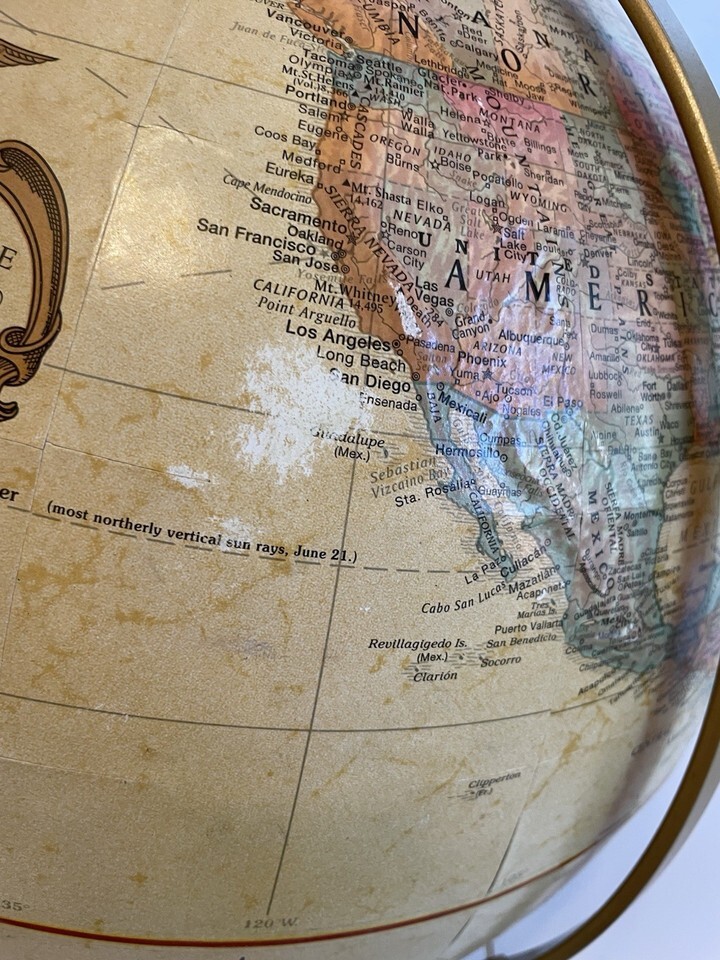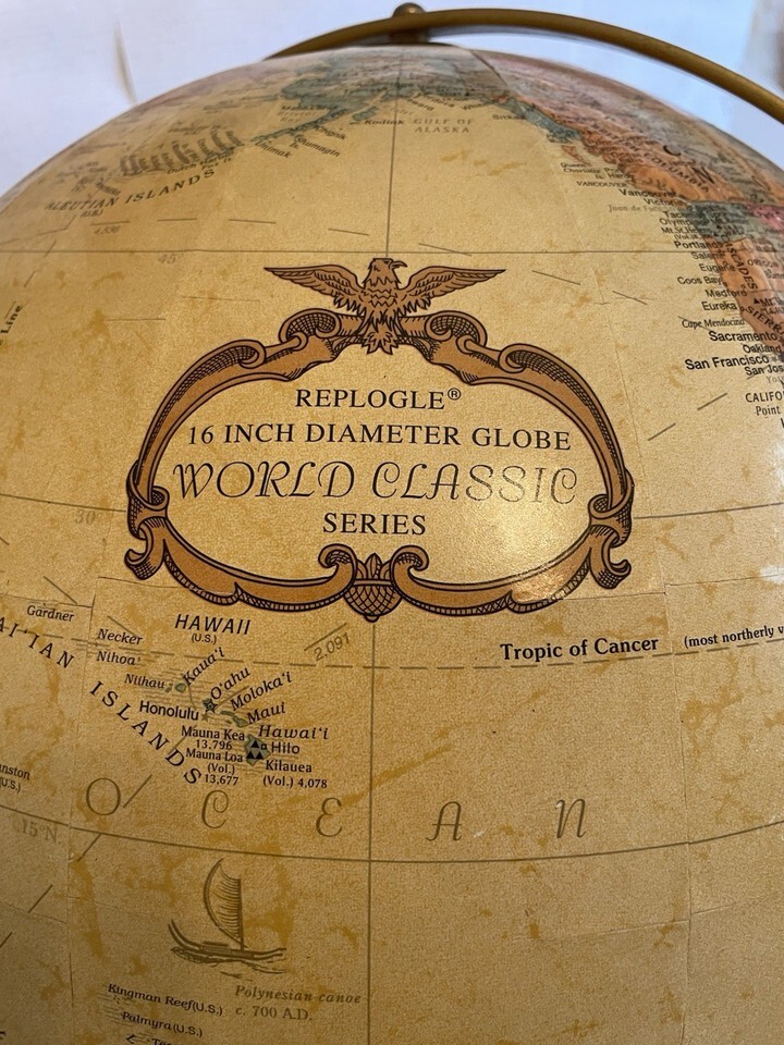 The Vintage Replogle 16? Diameter Raised Surfaces Globe from the 1970s is a classic series world globe that showcases intricate detail and craftsmanship. This antique reproduction features a rotating design (STAND NOT INCLUDED) and a beige color scheme, making it a stylish and functional piece for any home or office decor. The diameter of 16 inches allows for a clear and comprehensive view of the world, making it a timeless and educational addition to any space.