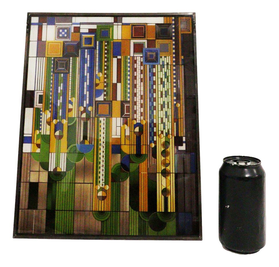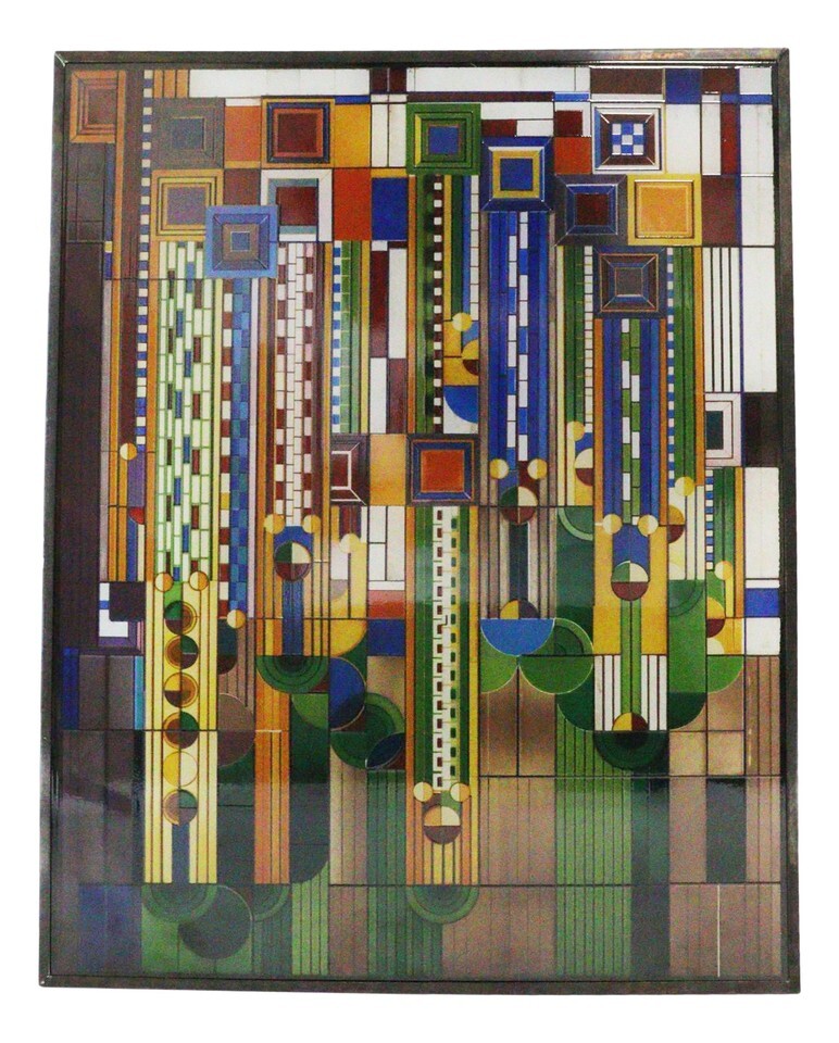 ? This Frank Lloyd Wright Saguaro Metal Framed Stained Glass vividly recreates one of Wright's most popular designs. The design is one of a number of Liberty Magazine cover designs from 1926-27 that the editors thought to be too "radical" and never used. In 1973 there was a fire in the Arizona Biltmore. This graphic was selected from the Frank Lloyd Wright Archive to be rendered in stained glass in the reconstructed foyer.