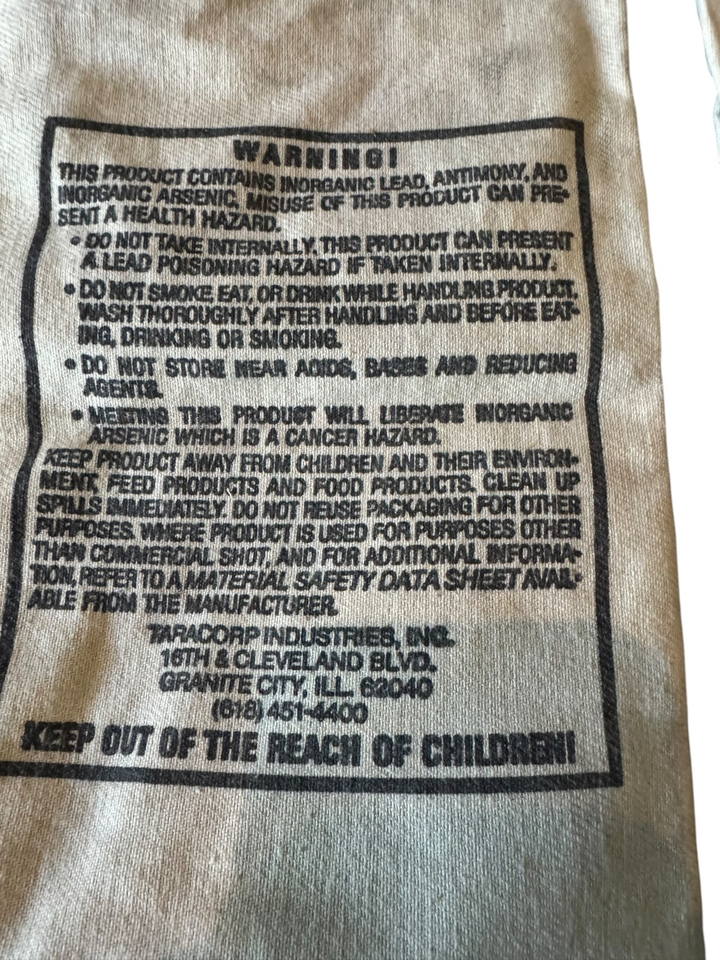 Set of three vintage Lawrence Brand cloth shot bags ? two Magnum Shot and one Chilled Lead Shot ? each originally holding 25 pounds of lead shot (now empty). Light wear, small stains, and some edge fraying consistent with age and storage.