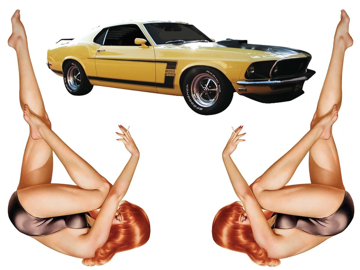 Mustang Yellow Hemi Pin up Girl, Rhianna x2, 3 Large Laminated vinyl decals