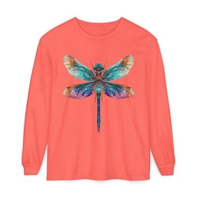 This long-sleeve garment-dyed shirt carries a luminous watercolor dragonfly across the chest ? a quiet celebration of slow afternoons by the river and pockets of wilderness folded into city life. Soft, lived-in color and a medium-weight cotton body give it a gentle drape and approachable warmth. Wear it layered with a vest on breezy hikes, around a campfire with friends, or simply as your go-to piece for sketching, gardening, or rainy-day reading. The classic fit and ribbed cuffs keep the silhouette familiar while the hand-dyed finish and vibrant print make each shirt feel like a small, personal find. It?s for people who notice the small, bright things: dew on wings, the hush after rain, the color that lingers on a memory.