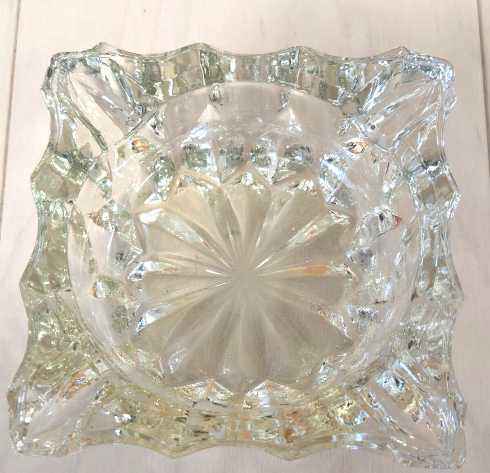 VIntage MCM/Art Deco Heavy but Compact Square Cut Glass 4 Slot Ashtray