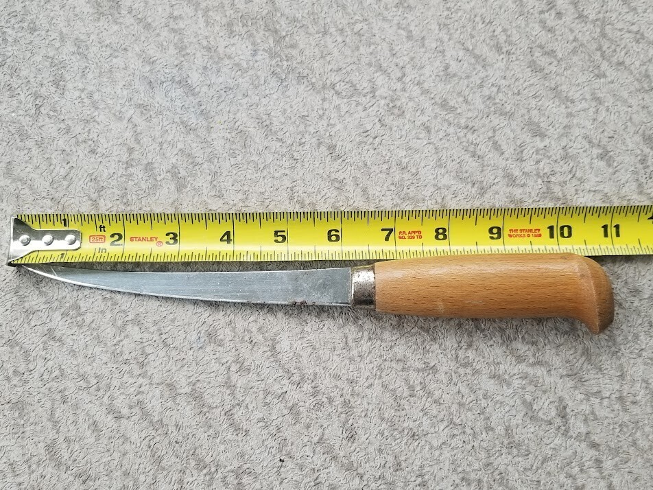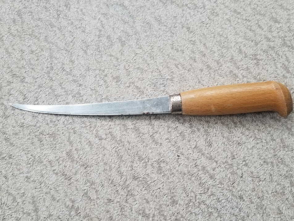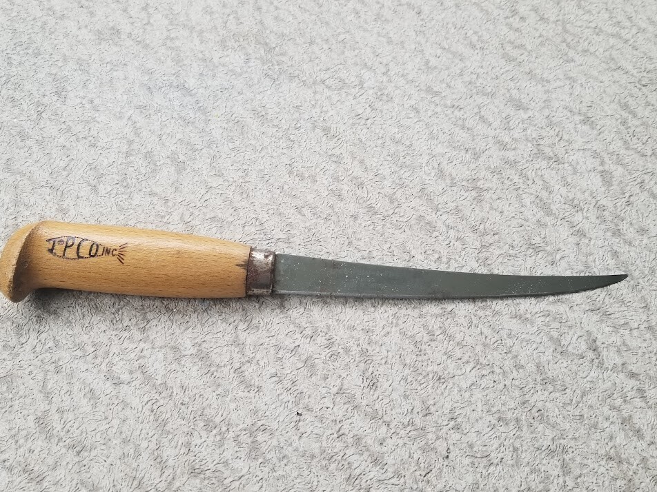 Up for bid is a pre-owned J P Co Inc fillet/larding knife that has a wood handle.
