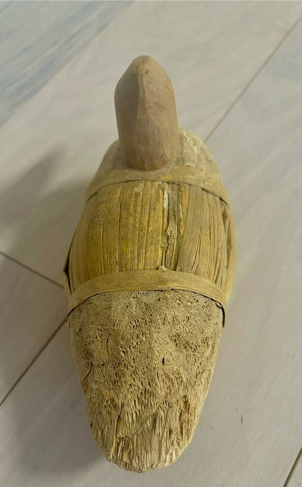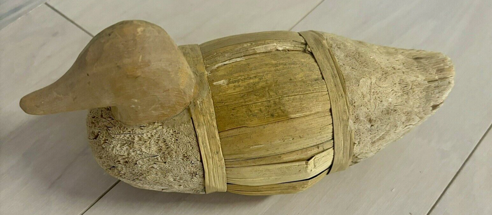 Up for bid is a Vintage "family" of ducks (Swans?) made from corn husks, wood and it appears that some cork was used. There is a mother measuring 12'' from beak to tail; a duckling measuring 9" from beak to tail, and a second duckling measuring 8" from beak to tail. These ducks can be displayed outside or inside the home. Please see the notes and photos of the condition of this set.