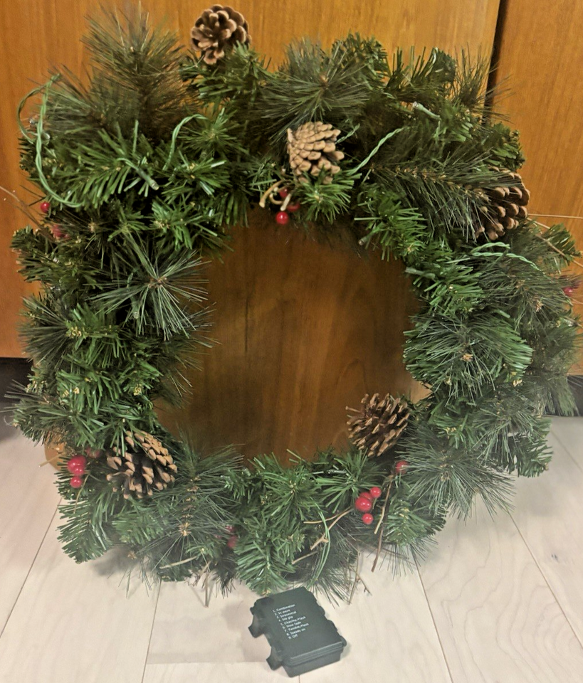 up for bid is a pre-owned 21" Artificial Christmas Wreath w/Pinecones and 9 different light settings. This item is in excellent pre-owned condition. No missing pieces, no fadings, all of the lights are accounted for, and all of the light settings are working flawlessly.