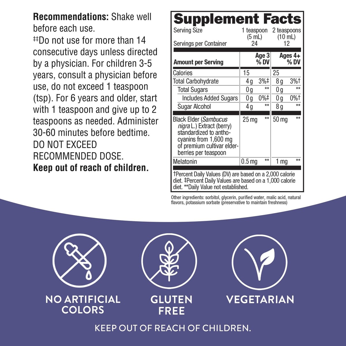 Expiration Date of 4/30/2026 ? Traditional immune support made for kids.* Specially formulated to meet the unique needs of children. ? Promotes restful sleep.* Contains melatonin for occasional sleeplessness to help promote restful sleep in children.* ? The dark berries of the European black elder (Sambucus nigra L.) have been traditionally used for immune support in the winter months.* ? Delicious flavor your kids will love. ? Gluten-free and vegan. No sugar, dairy, peanut, or artificial colors.