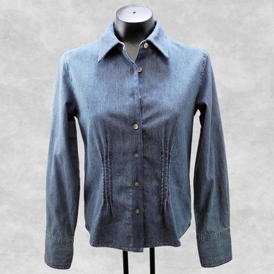 J.Jill fitted women's EXTRA SMALL denim shirt. Seven-button front with textured blue cotton fabric at the collar, placket and cuff lining. Pintucks in the front and darts in the back create a nice fitted look. Long sleeves with two-button closures at the cuffs. Straight hem. 100% Cotton, Machine Wash.