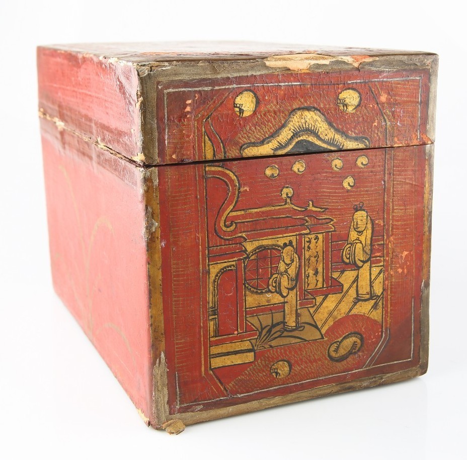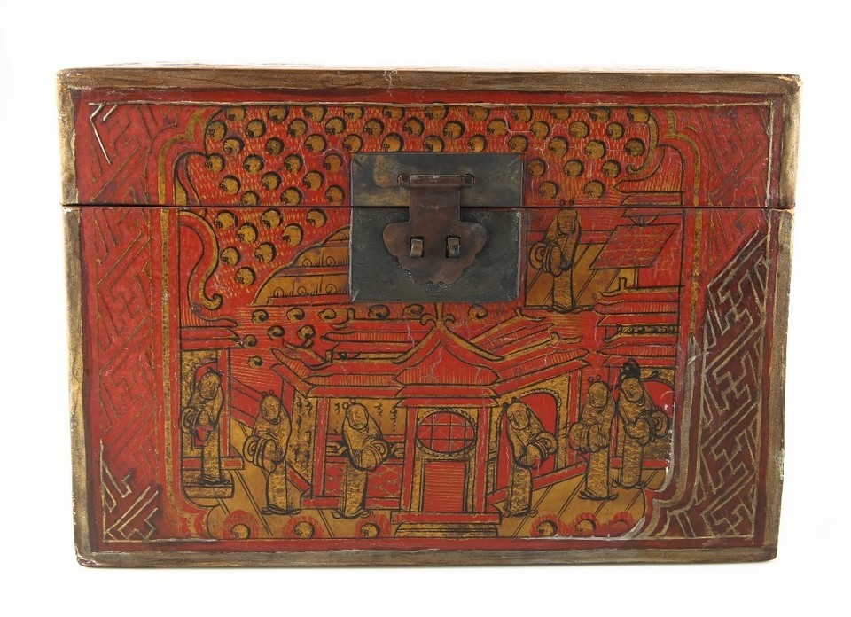 Antique Chinese Red Gold Lacquer Wooden Box Hand-Painted Qing Dynasty w/ CoA