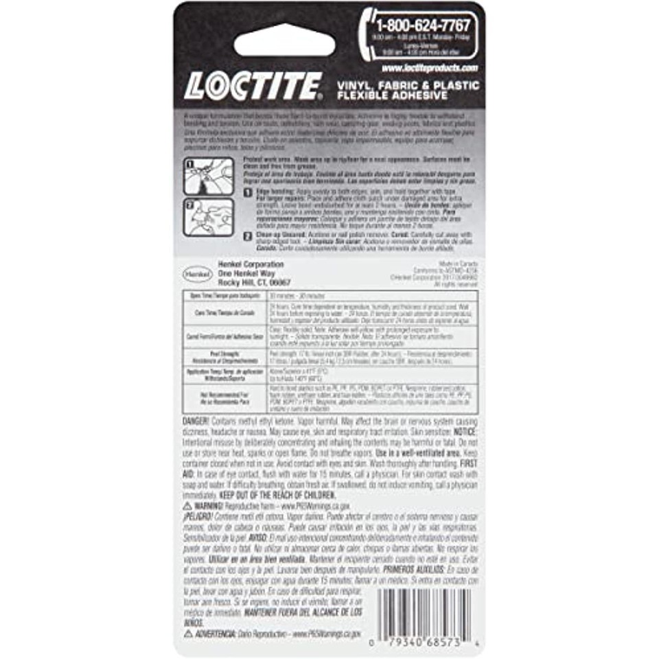 Product Description Vinyl fab plastic adhesive 1.0oz.. this product is manufactured in Canada. Product belongs to arts, crafts and sewing. From the Manufacturer For over 50 years, Loctite has provided customers with advanced adhesive and sealing solutions. Loctite Vinyl, Fabric and Plastic Flexible Adhesive is a clear liquid adhesive formulated for repairing and mending flexible plastics such as vinyl seats, cushions, tarps and outdoor gear. It dries to a transparent and waterproof bond. It will not yellow or go brittle with age or sunlight. Our uncompromising level of quality and innovation is achieved through a strong commitment to research and development. This commitment to innovation, quality and reliability has truly earned Loctite the reputation of delivering "Trusted Performance. Proven Results".