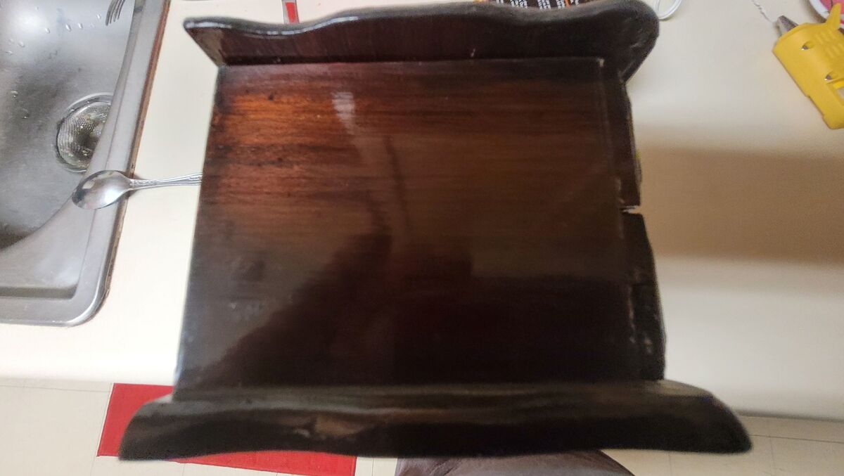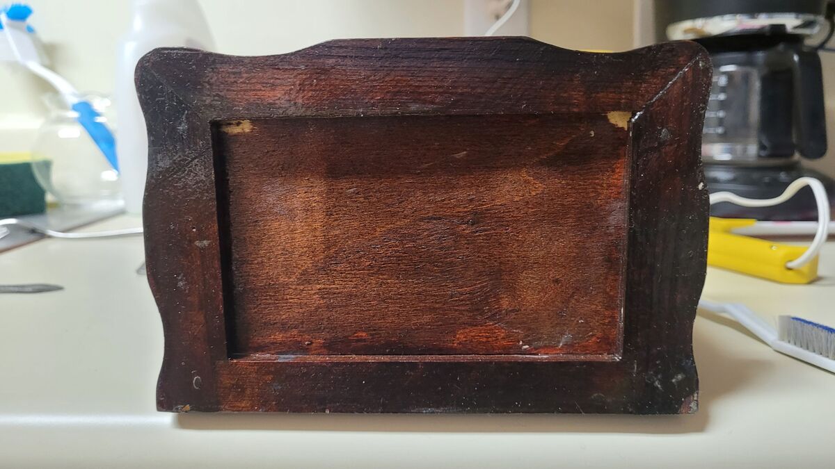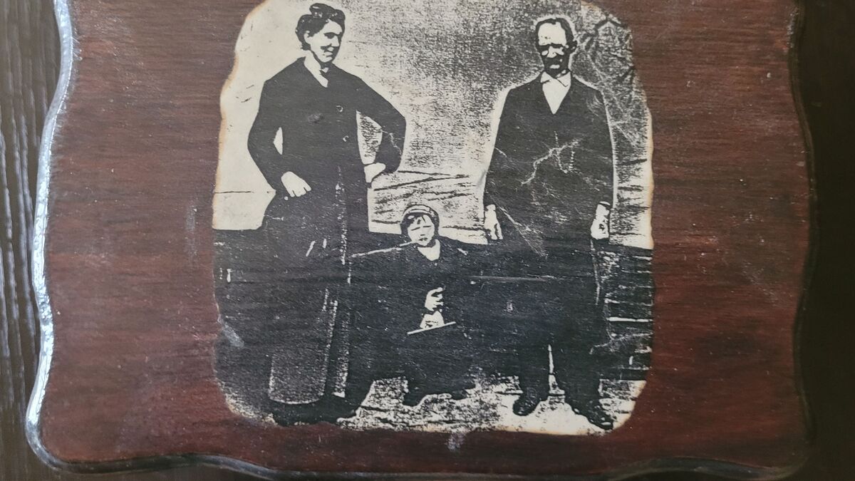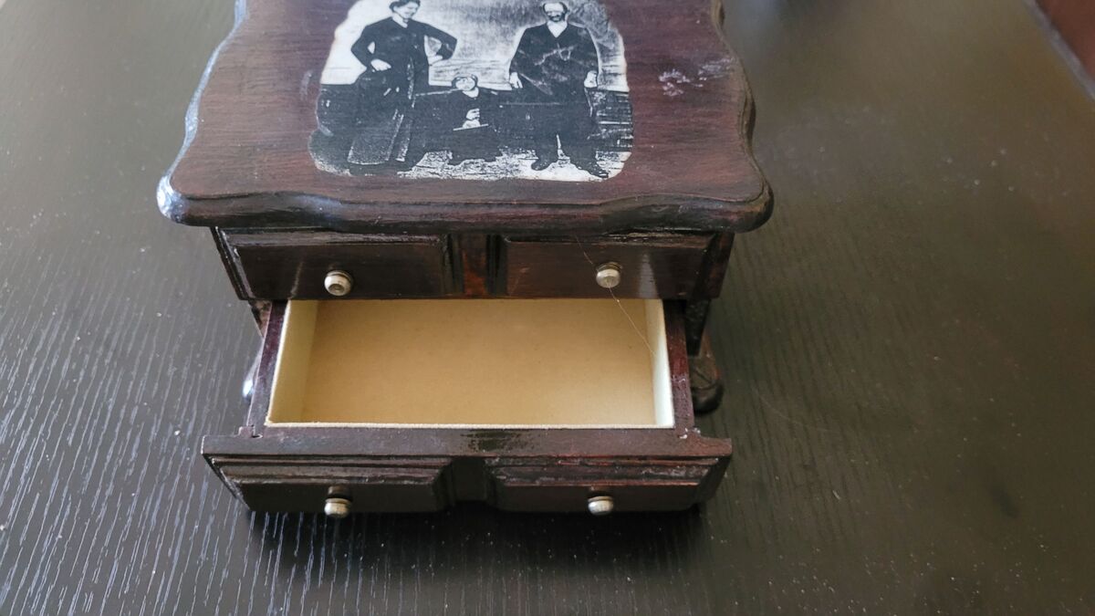 Solid handmade miniature, and nicely lacquered. A black and white distressed photo of a man, womam and child is on the lid.