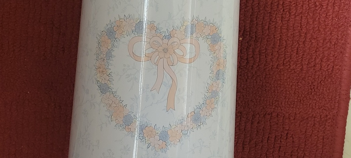 Very clean both inside and out, with a wreath design on the front. 15.5" x 5" x 6" with a swivel base for ease of dispensing. Has had little to no usage.
