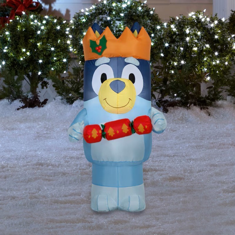 3.5-FT x H 1.9-FT W x 2.7-FT D indoor/outdoor Airblown Inflatable Bluey with crown and Christmas cracker