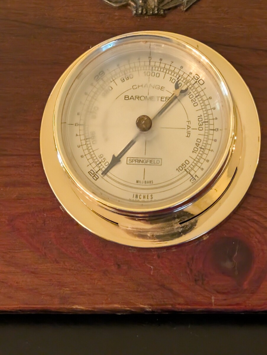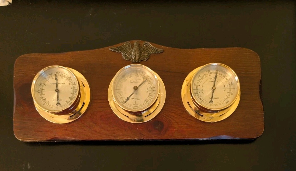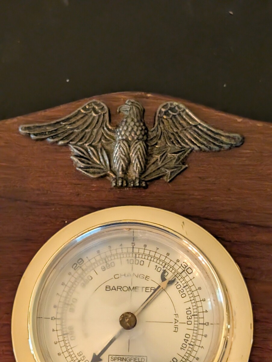 ?Add a touch of classic Americana to your home or office with this vintage Springfield weather station. Mounted on a dark-stained wooden plaque and accented with a decorative eagle emblem on the top edge, this piece combines functionality with traditional style.
