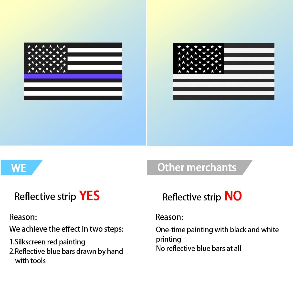 ?High Quality Adhesive Stickers?: Our American flag stickers are made of high quality vinyl and come with high-tack tape on the back. Hand printed with reflective inks to make your car stand out in the day or night!