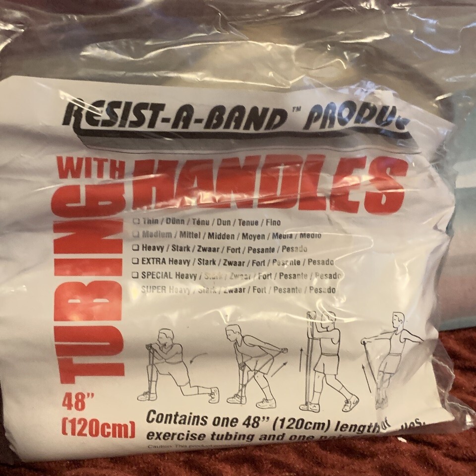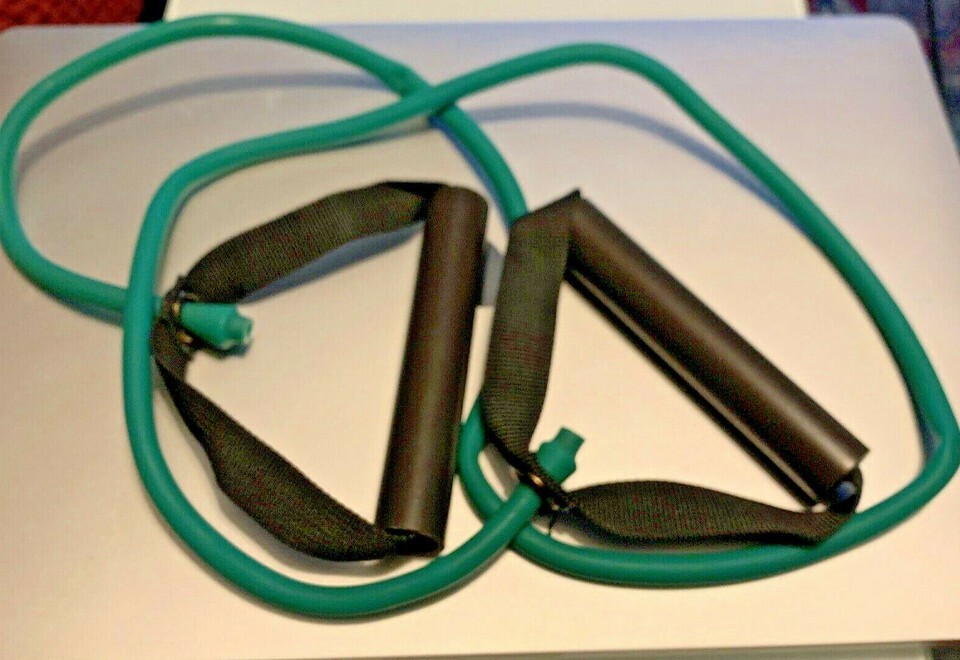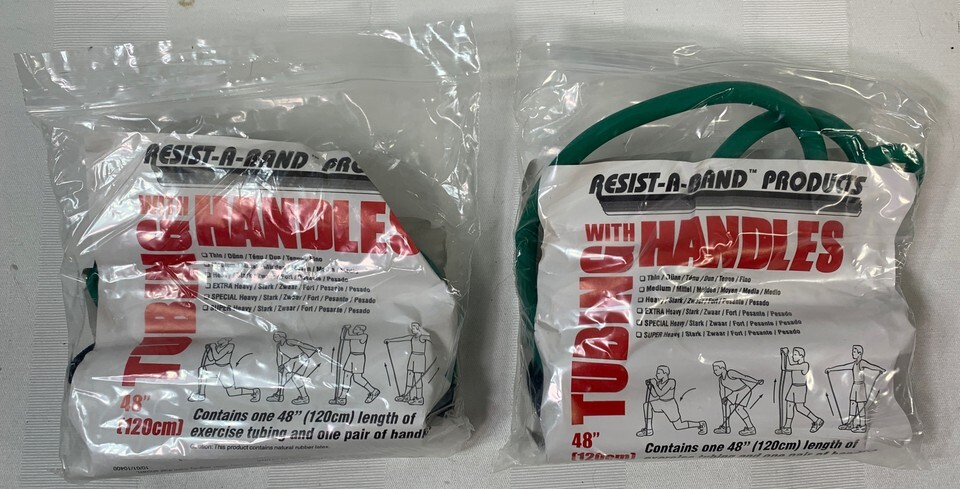 Enhance your fitness routine with this set of two Resist-A-Band Latex Tubing with Handles, each measuring 48" (120cm) in length. These resistance bands are perfect for home use and can be utilized for exercising various muscle groups, including the arms. The green-colored bands are made of latex material and feature an exercise model, with no vintage or custom bundle.