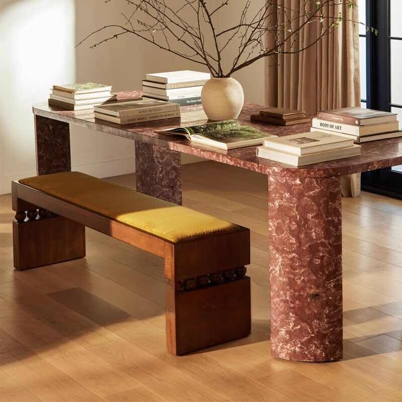 Elevate your home with this exquisite vintage-inspired solid wood long bench, measuring 51.2" x 14.6" x 17.7". Featuring distinctive hand-finished geometric pedestal accents and a plush mustard yellow cushion, this versatile piece combines timeless charm with practical functionality. The robust classic construction showcases intricate artisan details, stable block-style legs, and decorative sphere trim that add artistic flair to any space. Perfect for entryways, living rooms, or as an elegant accent at the foot of your bed, this bench seamlessly blends retro French aesthetics with modern comfort. Its thoughtful design makes it ideal for hallways, window seats, or casual dining areas, complementing mid-century, wabi-sabi, or eclectic interior styles. The bold lines and nostalgic details create both functional seating and statement style for contemporary or vintage-inspired spaces.
