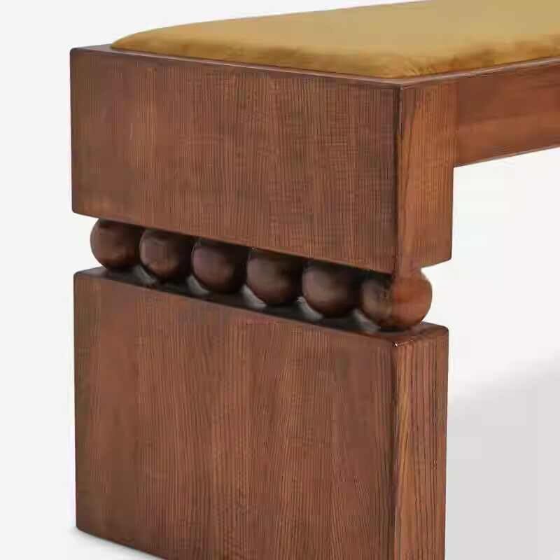 Product description: Elevate your home with this exquisite vintage-inspired solid wood long bench, measuring 51.2" x 14.6" x 17.7". Featuring distinctive hand-finished geometric pedestal accents and a plush mustard yellow cushion, this versatile piece combines timeless charm with practical functionality. The robust classic construction showcases intricate artisan details, stable block-style legs, and decorative sphere trim that add artistic flair to any space. Perfect for entryways, living rooms, or as an elegant accent at the foot of your bed, this bench seamlessly blends retro French aesthetics with modern comfort. Its thoughtful design makes it ideal for hallways, window seats, or casual dining areas, complementing mid-century, wabi-sabi, or eclectic interior styles. The bold lines and nostalgic details create both functional seating and statement style for contemporary or vintage-inspired spaces.