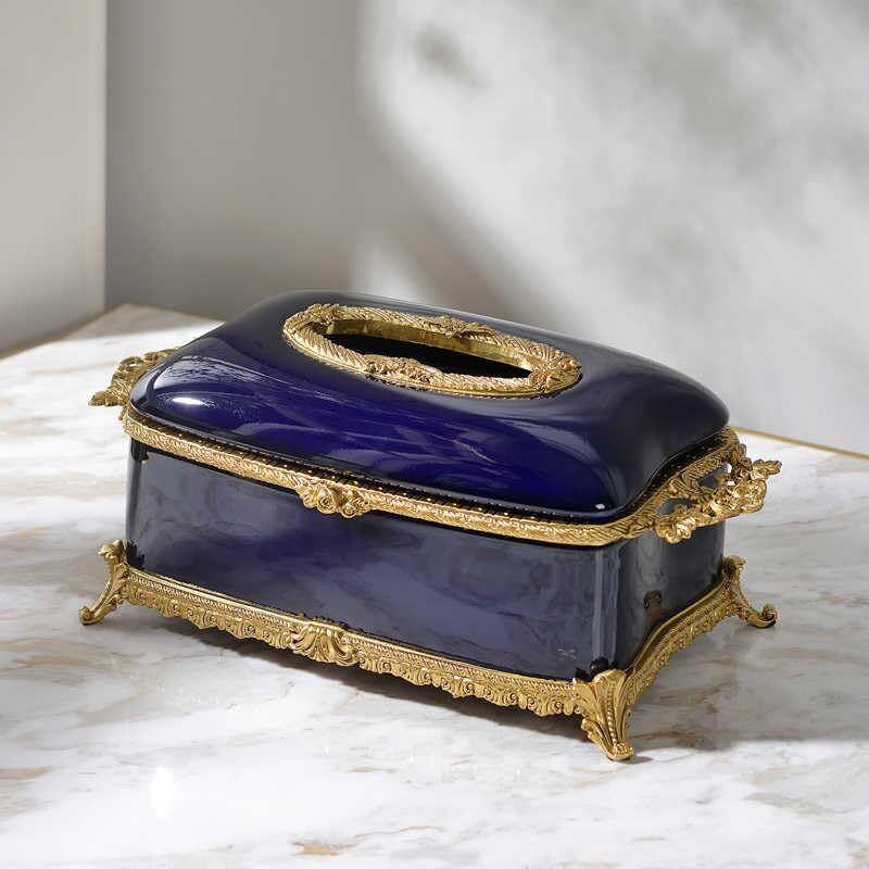 Product description: Transform your space with this exquisite royal blue porcelain tissue box holder adorned with elaborate aged brass detailing. The high-fired porcelain showcases a rich, glossy blue finish complemented by ornamental brass scrollwork that adds a touch of timeless elegance to any setting. Measuring 11.8" 6.3" 4.8", this versatile napkin dispenser fits standard tissue boxes and enhances dining tables, living rooms, office desks, and guest spaces with sophisticated style. The practical removable lid design allows for effortless refills, while the handcrafted construction ensures both stability and lasting beauty. Each Interoknack tissue holder combines functionality with artistic craftsmanship, making it an impressive addition to your home decor or a thoughtful gift for special occasions. The sturdy base prevents tipping, protecting surfaces while elevating your interior design with European-inspired luxury.