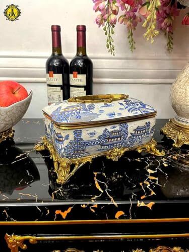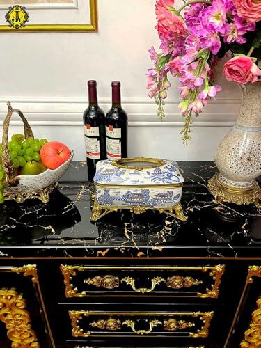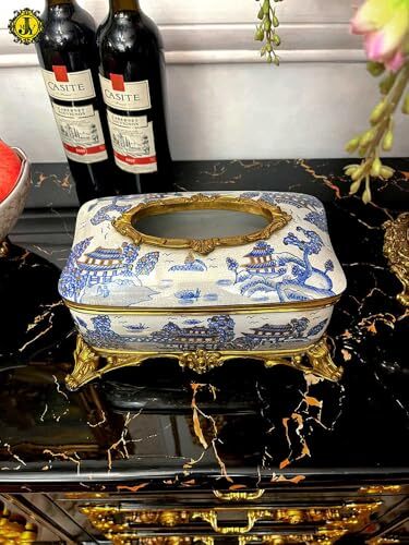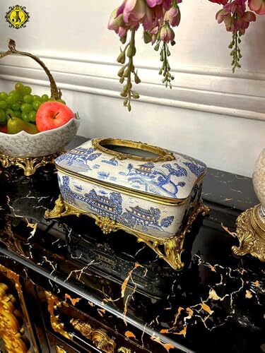 Product description: Elevate your home decor with this stunning blue and white porcelain tissue box from Decora. Measuring 10.2 x 6.9 x 5.3 inches, this luxury piece features intricate hand-cast brass accents and sits elegantly on a decorative base, adding sophistication to any room. The smooth, high-quality porcelain construction ensures durability and easy maintenance, while the ornate brass footed frame provides both stability and opulence. Perfect for living rooms, dining tables, or entryways, this versatile tissue holder complements classical, modern, and eclectic interior styles. The spacious design accommodates standard tissue boxes or napkin packs, seamlessly blending functionality with refined aesthetics. Make a statement in your home with this exquisite decorative piece that serves as both a practical accessory and an artistic conversation starter.