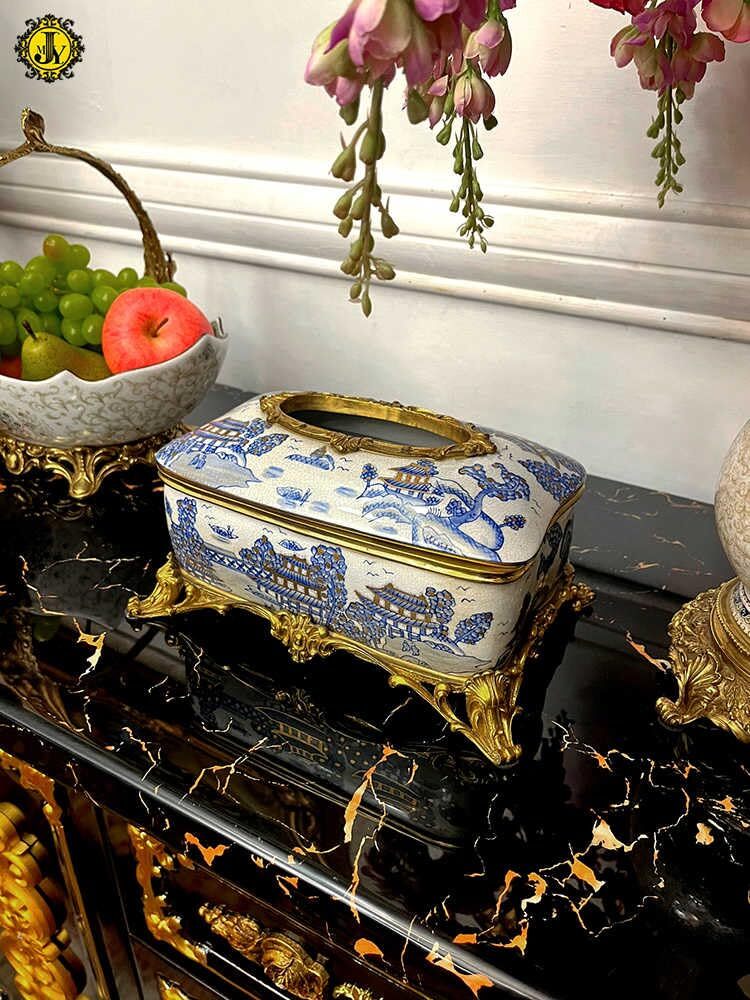 Luxury Blue and White Porcelain Tissue Box with Brass Accents Decorative Napki