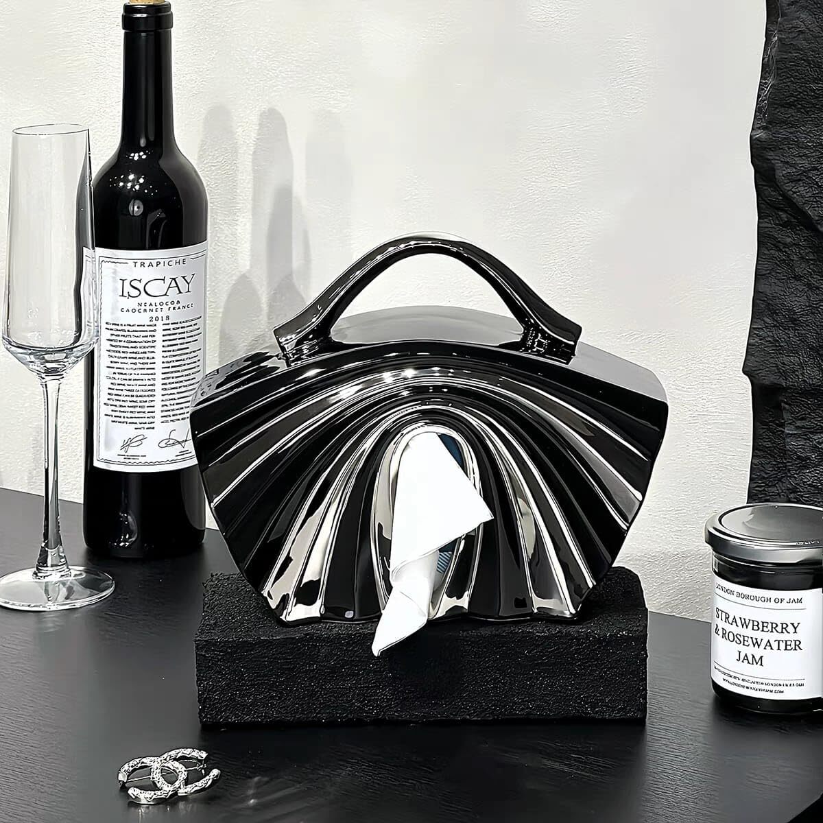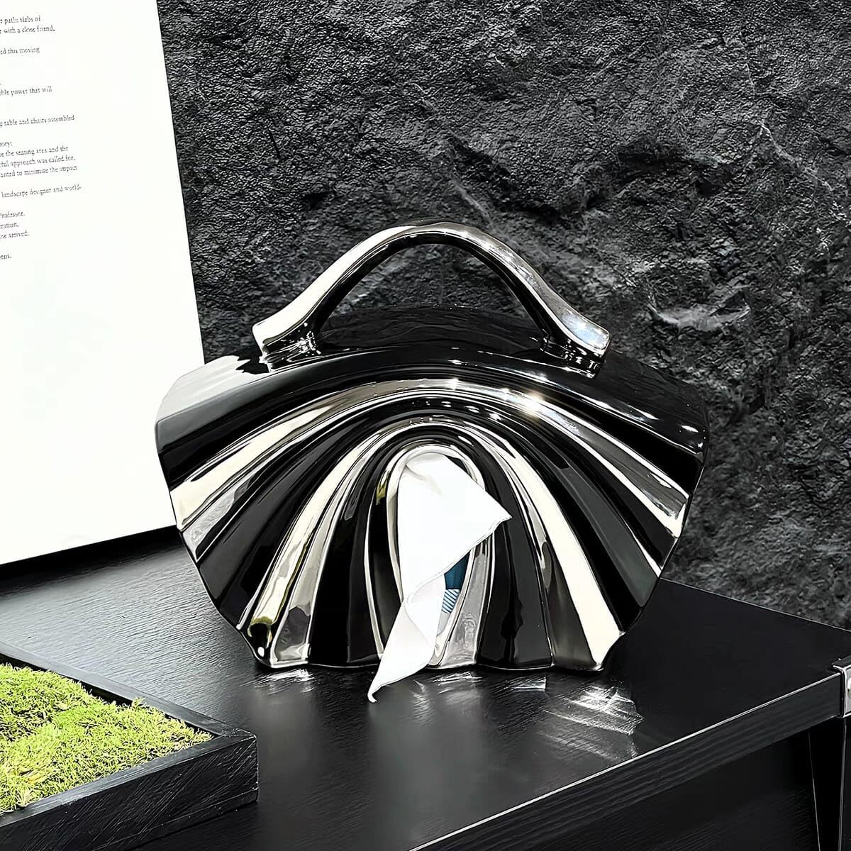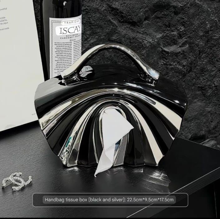 Product description: Elevate your space with this statement-making luxury tissue paper holder, designed in a stunning chrome handbag shape. A perfect blend of function and fashion, this napkin dispenser adds a touch of glamour to your home or office. Whether you place it in the living room, bathroom, vanity, or workspace, it effortlessly complements modern, contemporary, and minimalist decor styles.