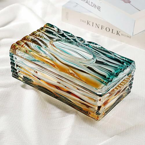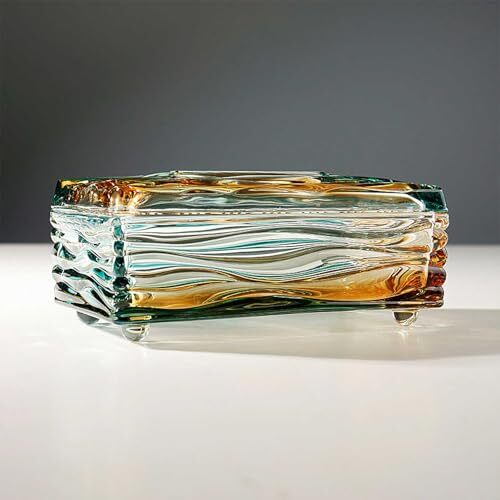Product description: Elevate your space with this exquisite Emerald Gold Wave Glass Tissue Box, where everyday functionality meets artistic elegance. This masterfully crafted piece showcases mesmerizing wave patterns that blend rich emerald green with lustrous gold accents, creating an enchanting visual display that transforms with ambient light. The substantial crystal construction, weighing 3.7 lbs, speaks to its premium quality while maintaining perfect proportions at 8.7 inches long and 4.7 inches wide. The thoughtfully designed 3.5 x 1.4 inch opening accommodates standard tissues with ease. The alternating translucent and clear sections create stunning light effects, making this piece a sophisticated focal point in any setting. Whether gracing your living room, dining area, or powder room, this artisanal tissue holder serves as both a practical accessory and a statement piece that exemplifies refined taste. The timeless combination of emerald and gold tones harmonizes beautifully with both modern and classic interior styles, making it a versatile addition to any curated space.