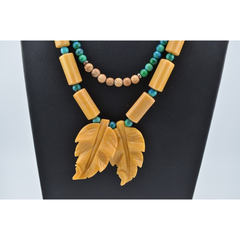 Navajo Mary W. Roanhorse Carved Leaf and Gem Pendant Necklace Set
