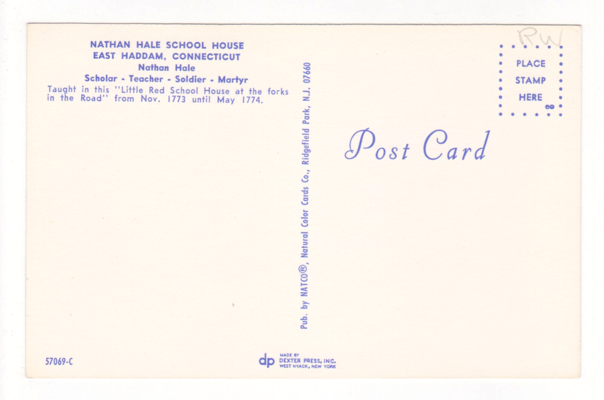 Vtg Postcard-Nathan Hale School House-East Haddam Ct-Soldier Teacher-Chrome-CT1