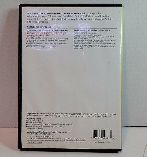 The Microsoft Office 2003 Student and Teacher Edition Full Version is a comprehensive office software suite designed specifically for academic and educational use. This CD format product includes essential tools such as Word, Excel, PowerPoint, and Outlook, making it a versatile resource for students and teachers. With a minimum RAM requirement of 128 MB, this edition is compatible with Microsoft Windows 2000, XP, and newer operating systems. The license category for this product is Academic/Education, with a standard licensing agreement that allows for use on one device. This full version of Microsoft Office 2003 offers a reliable and efficient solution for everyday productivity needs.