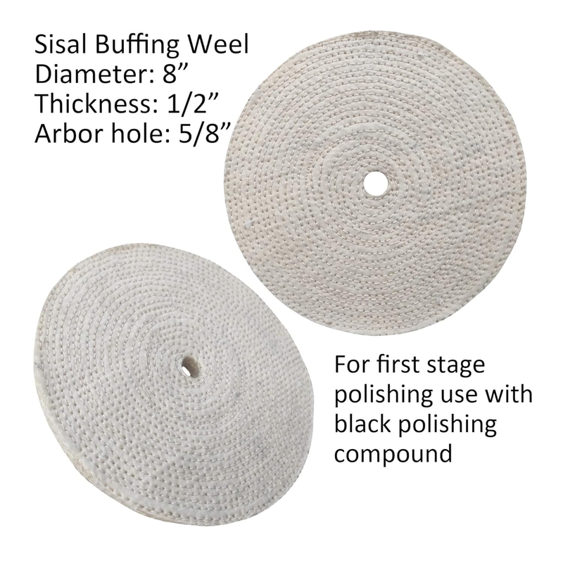 "3 Steps 8 Inch stainless steel polishing Kit: Used on 8 Inch bench grinder for stainless steel polishing. This kit includes 3pcs stainless steel polishing wheel and 3pcs stainless steel buffing compound. Sizes and details of the buffing wheels: All buffing wheels with 5/8 Inch arbor hole and 1/2 Inch thickness. 1PC 8 Inch sisal buffing wheel, made of fine sisal cloth and cotton cloth, spiral sewn, coarse for first stage polishing. 1PC 8 Inch denim buffing pad, made of denim cloth, concentric sewn, for middle stage polishing. 1PC 8 Inch cotton buffing wheel, made of fine cotton cloth, concentric sewn, soft for final stage polishing. Size and details of the buffing compounds: 1pc 100g bar black polishing compound for first stage polishing. 1pc 100g bar green polishing compound for middle stage polishing. 1pc 100g bar white polishing compound for final stage polishing. 3 steps for stainless steel polishing: Step 1: Use sisal buffing wheel with black polishing compound to polish the marks and scratches on the stainless steel products. Step 2: Use denim buffing pad with green polishing compound to polish the dull finish let by step 1 process. Step 3: Use cotton buffing wheel with white polishing compound to do the final high polishing."