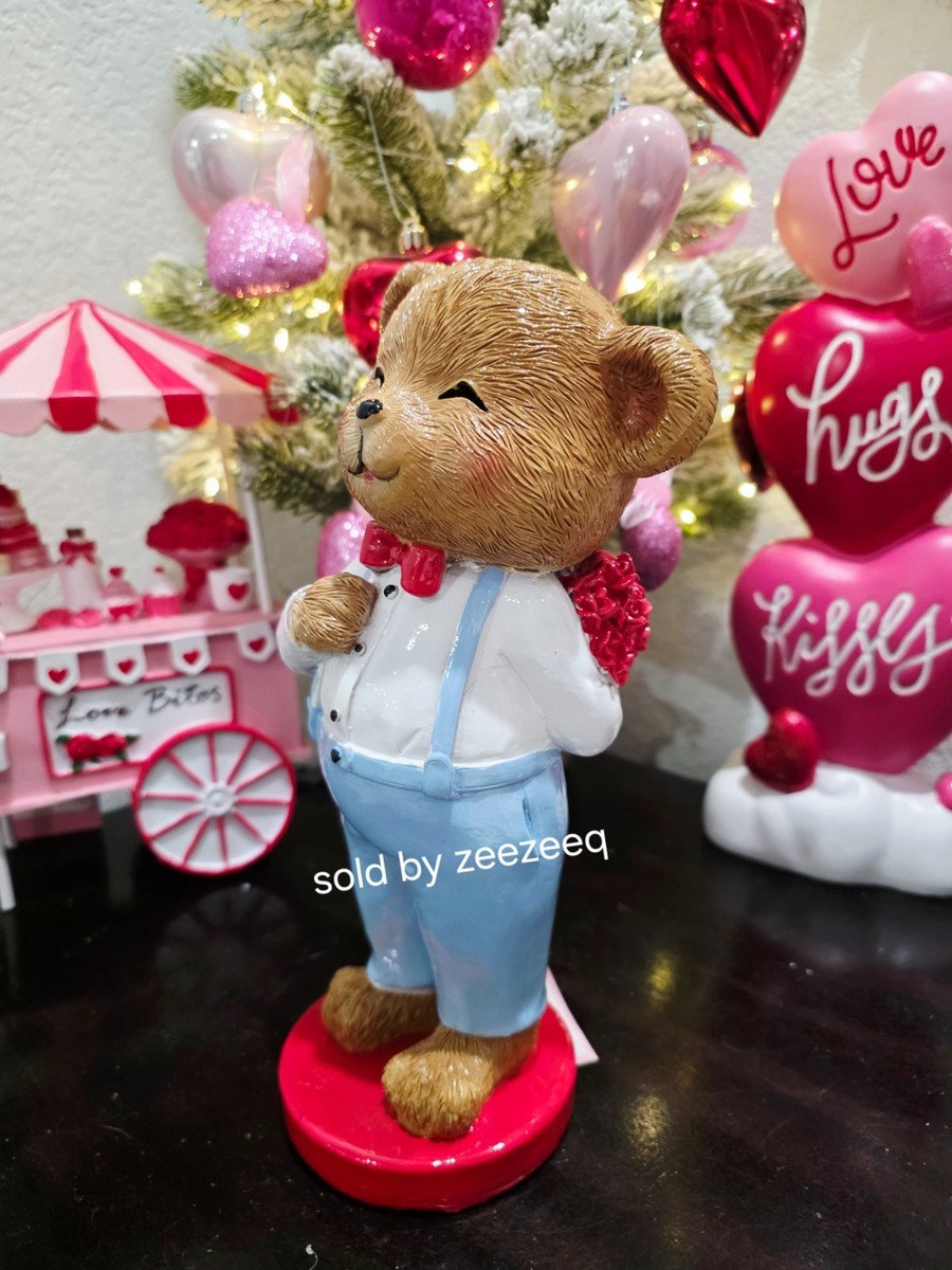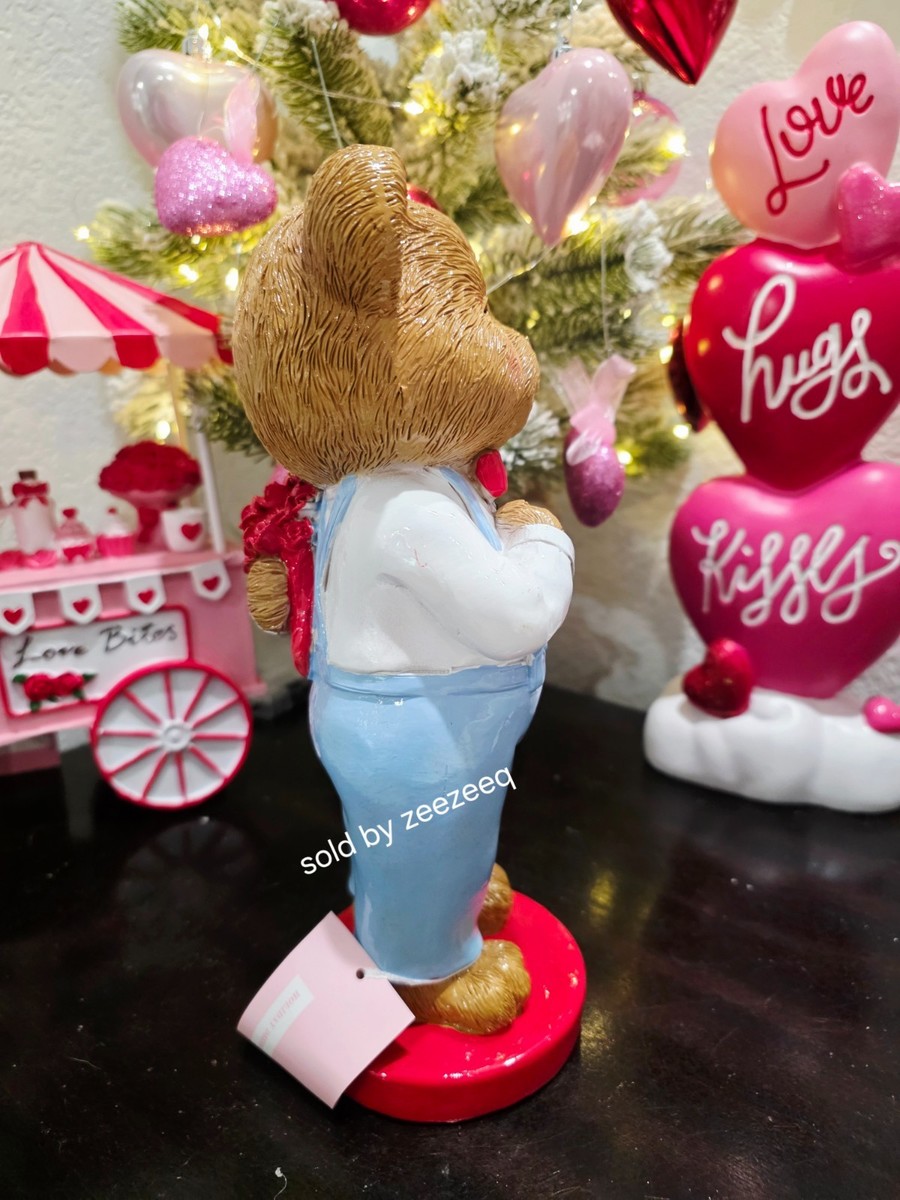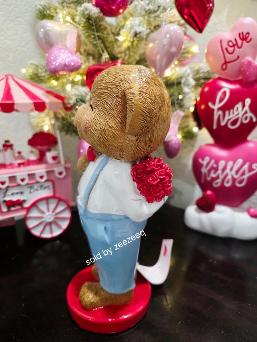 Up for sale we have this adorable bear holding a bouquet of Valentines red roses. He is sooo cute! He is wearing blue pants with suspenders and is hiding a bouquet of red roses. Made of resin it stands approx 9.5" tall. Soooo cute!! New Background items are available in my store.