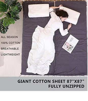 This XL sleeping sheet is super comfy for travel, and you can totally toss and turn in it without getting tangled up. It's got zippers all the way around the left, right, and bottom, so you can hop in and out from any side of your bed and even stick your feet out if you want to stretch. Plus, this cool sleep sack can even turn into one big cotton bed sheet when you unzip it all the way. Oh, and there's a pocket to keep your pillow from sliding around.