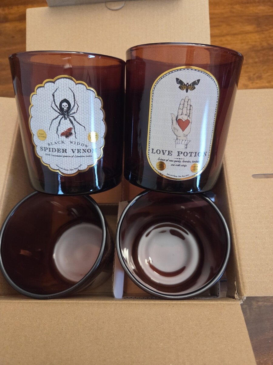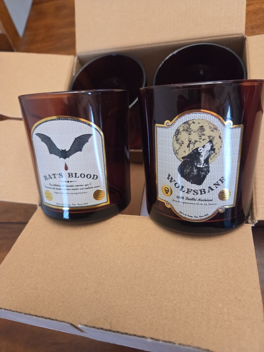 This is a set of Threshold Halloween 4-piece Apothecary Barware drinking glasses. The glasses are decorated with labels for "Wolfsbane," "Bat's Blood," "Spider Venom," and "Love Potion." New in the box.