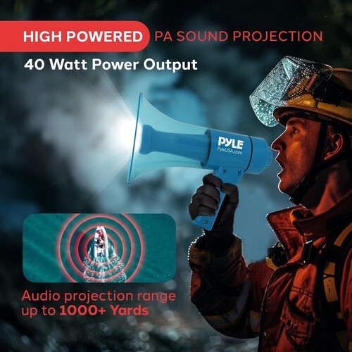 * POWERFUL VOICE AMPLIFIER: Talk be heard loud clear with the Pyle 40 Watt Water resistant Bullhorn Megaphone with a sound projection range of over 1000 square yard and a sound level of 130 decibels which can effectively get everyone's attention!