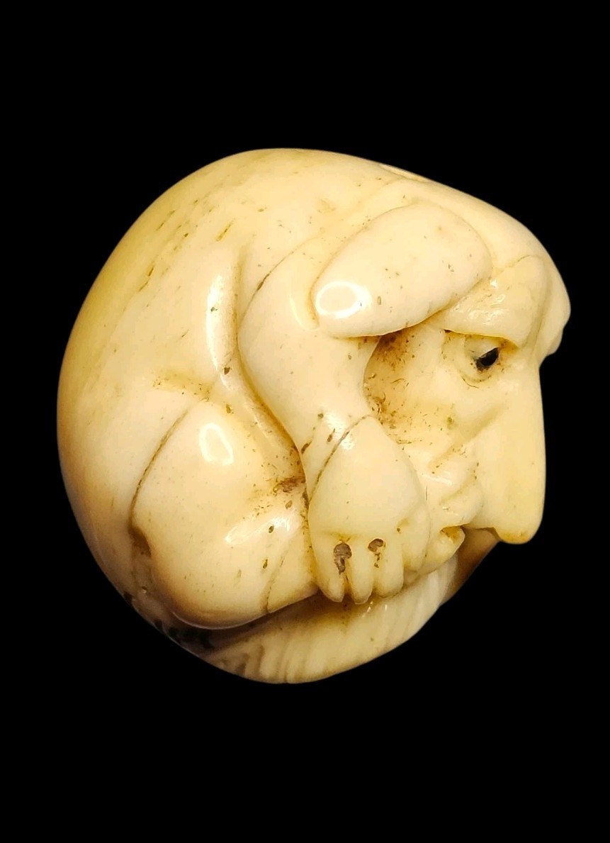 UP FOR SALE: Authentic vintage Japanese ojime bead depicting the Zodiac Dog, hand-carved in the early?mid Showa era (1930s?1950s). This piece features excellent carving detail with an expressive muzzle, tucked paws, rounded zodiac posture, and a clear two-kanji artisan signature on the underside. Beautiful natural patina with darkened recesses that only form on older beads.