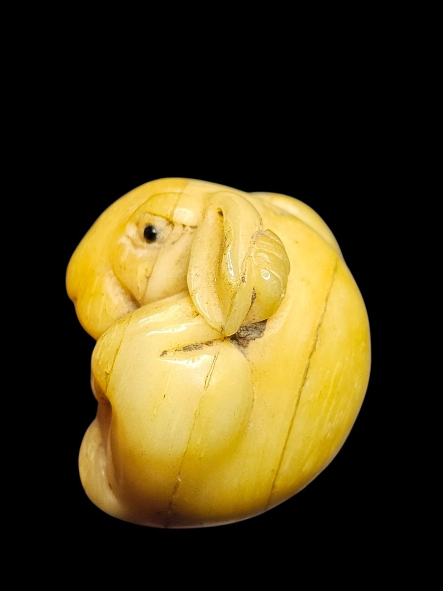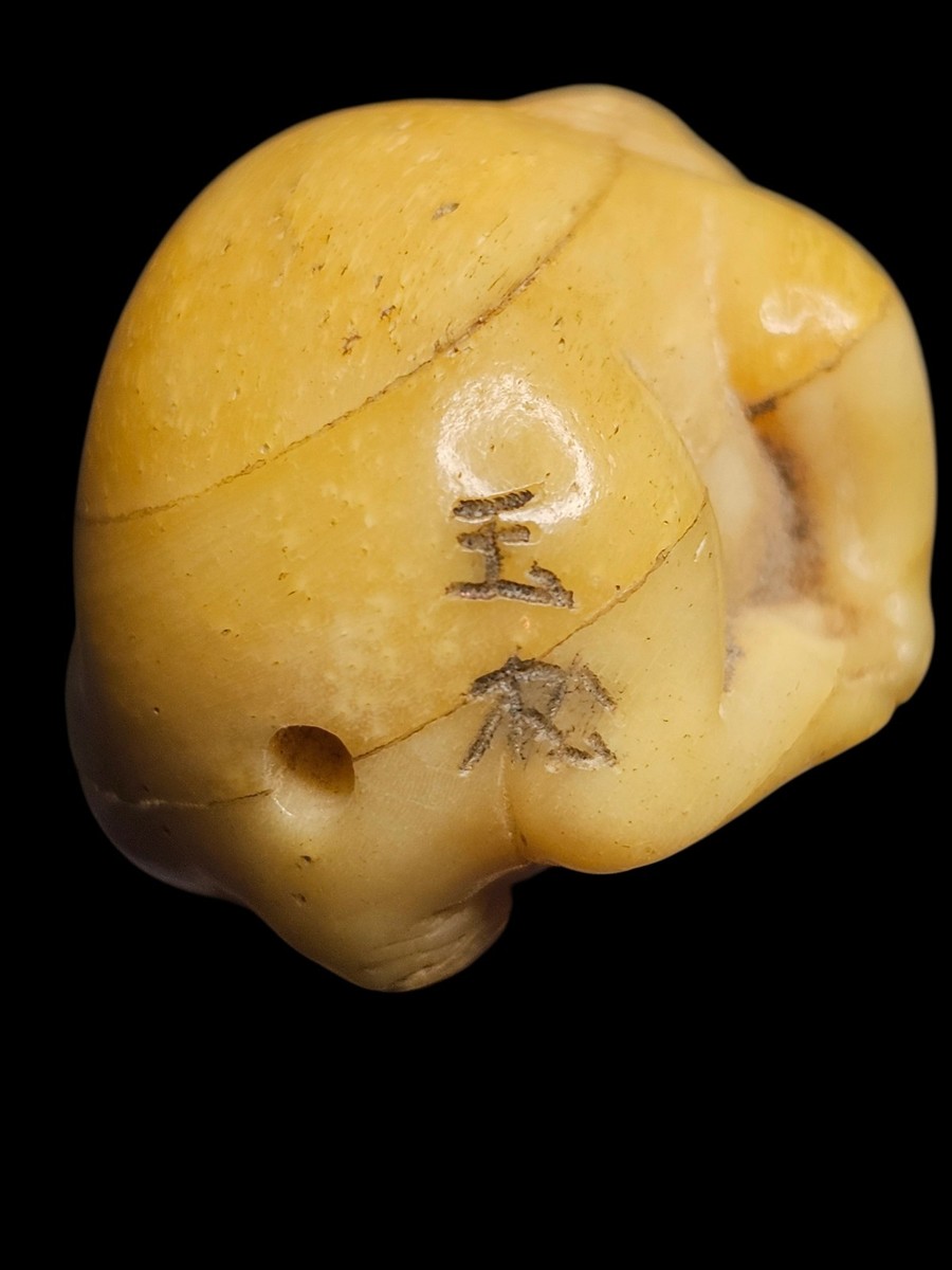 UP FOR SALE: Vintage Japanese ojime bead depicting the Zodiac Rabbit, hand-carved during the early?mid Showa era (1930s?1950s). This piece has wonderful facial expression, a curled zodiac posture, and finely carved details around the ears, paws, and tail. The bead carries a well-defined two-kanji artisan signature and displays beautiful natural patina typical of true mid-century beads.