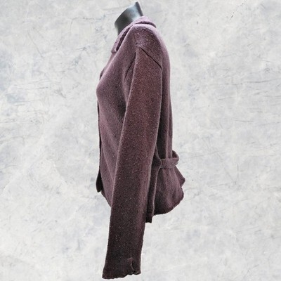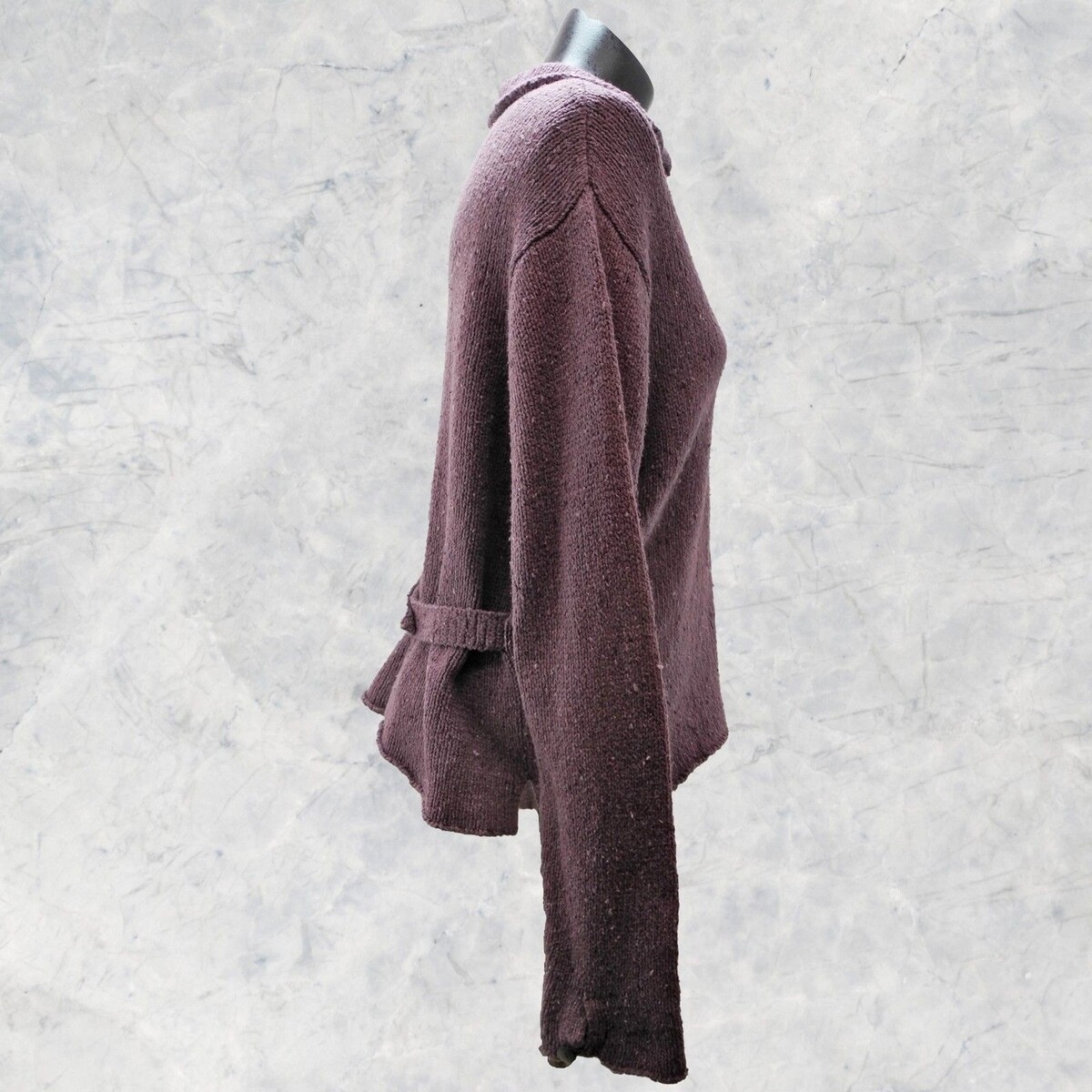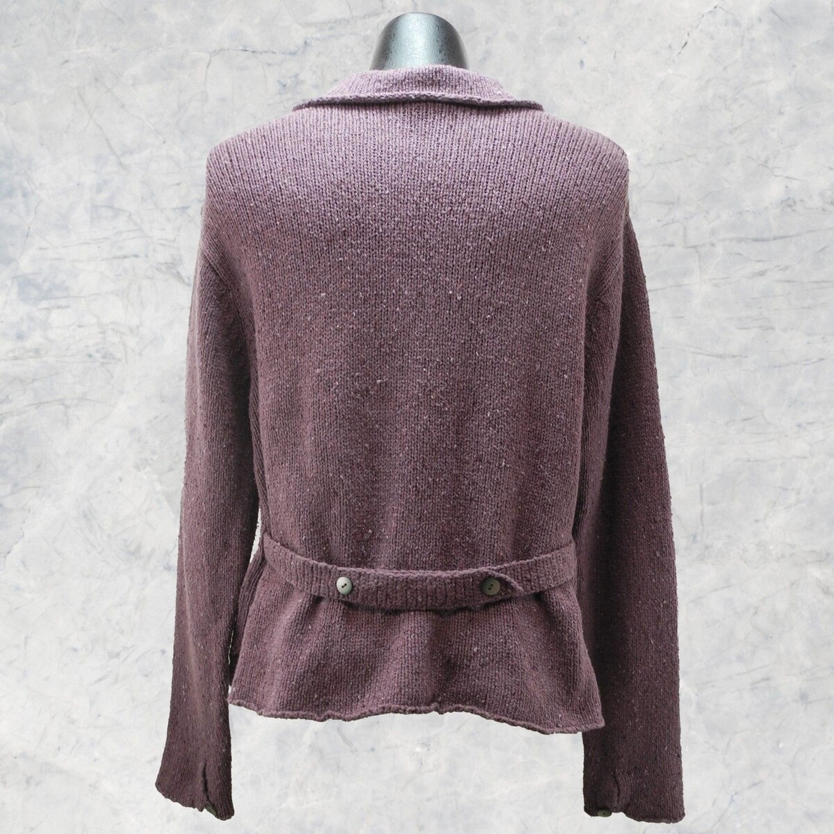 Add a touch of timeless style to your wardrobe with this classic J Jill sweater. Crafted from a soft and textured silk and wool blend, this piece features a beautiful heathered purple hue and a nubby knit texture. The collared neckline and button front design give it a polished, feminine look, while the back belt detail adds flattering shape and style.