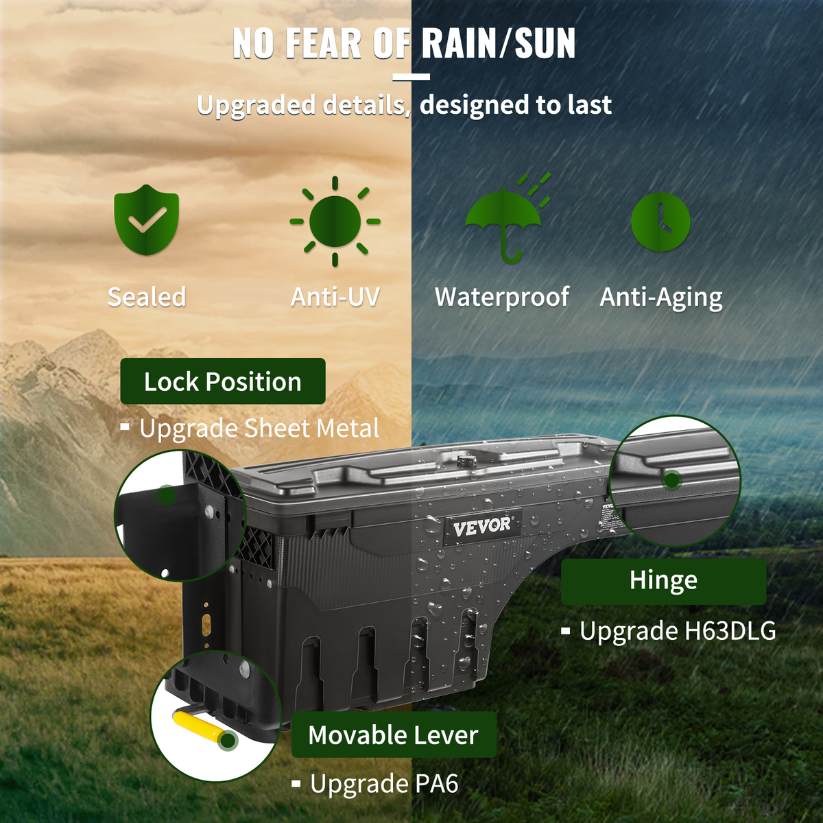 Toughness that Can't Be Matched: High-quality ABS composite material makes the VEVOR truck bed storage box lightweight while maintaining rigidness and durability. It protects your belongings against strong wind, water, and dust, and even stands up well to sun exposure. Don't let the elements ruin your day. As sleek as it gets while easy to clean and maintain!