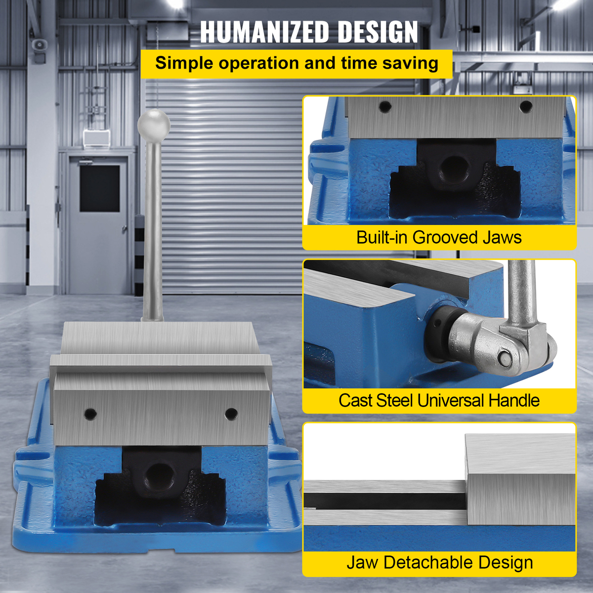Humanized Design: Our vises are detachable and can be replaced quickly. The unique downward pressure design protects the workpiece from escaping float when clamped. The hardened swivel handle is a universal joint structure, easy operation, flexible, and convenient to use.