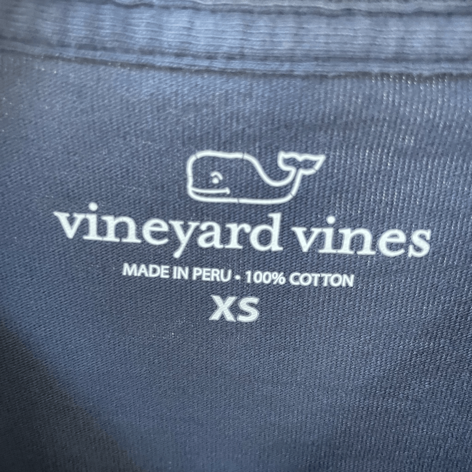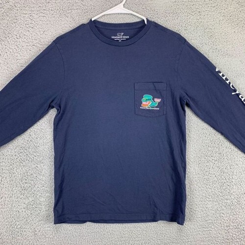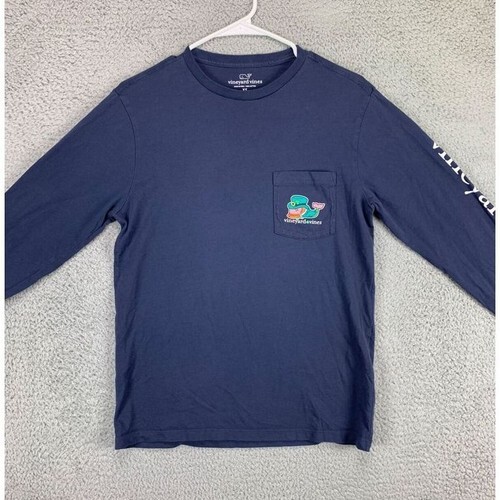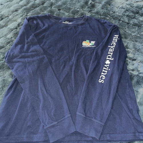Men?s vineyard vines long sleeve dark blue pocket T-shirt featuring a Saint Paddy?s Day whale on the front pocket and the same large graphic across the back. 100% Pima cotton. Laying flat measures approximately 24.5 inches should to hem and 18 inches armpit to armpit