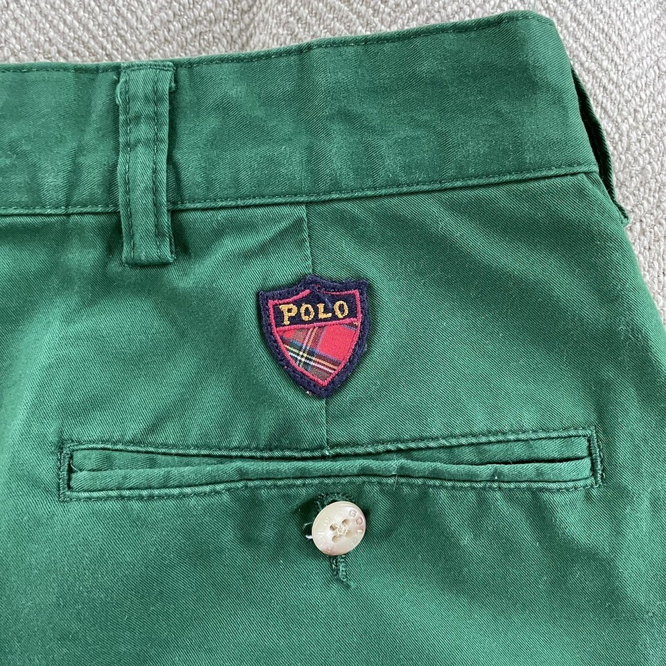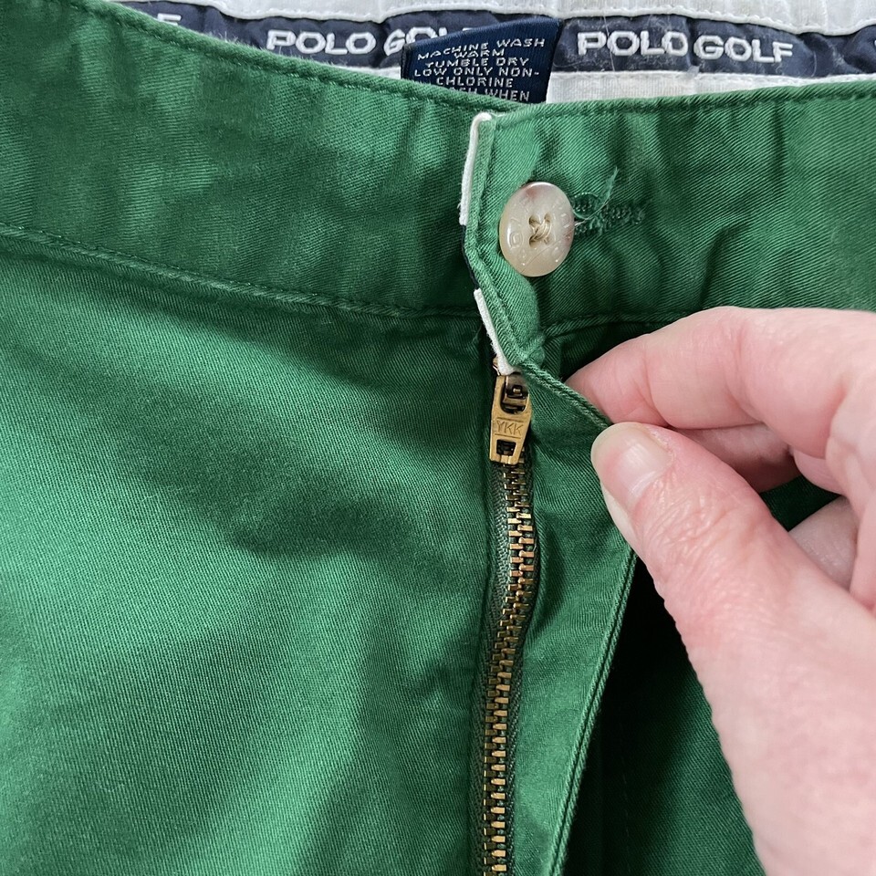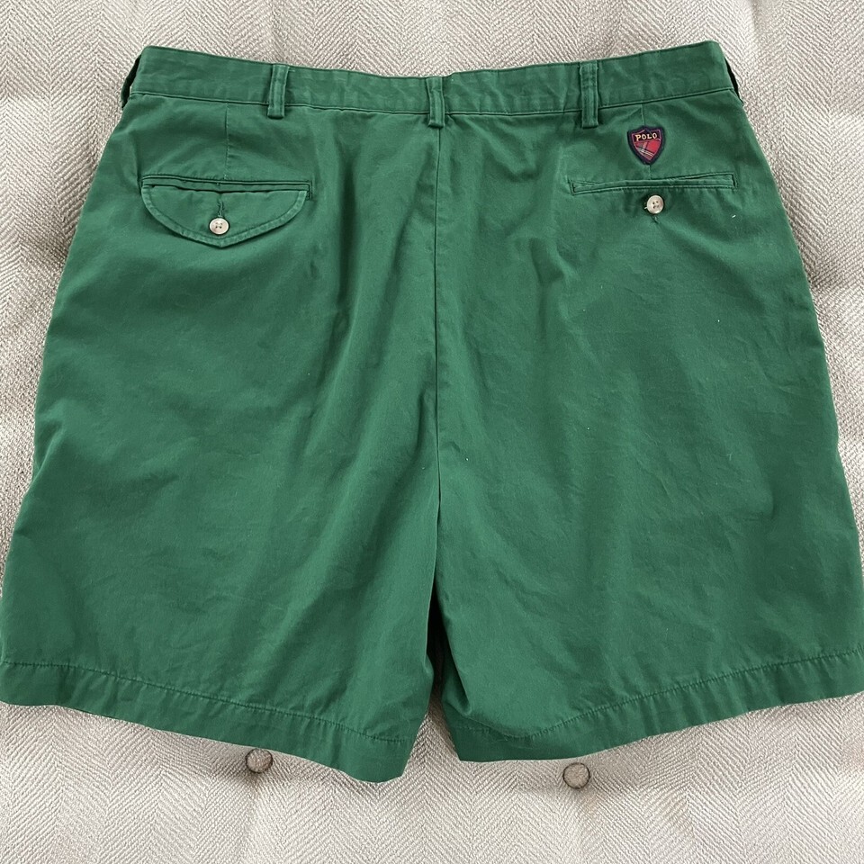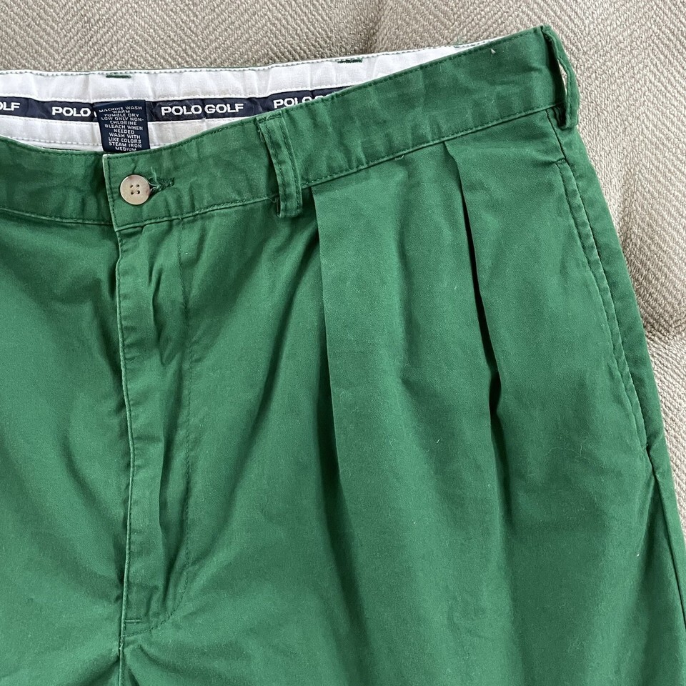 Ralph Lauren polo golf primary green color, front pleat, 100% cotton shorts. Hip pockets and 2 back button pockets, one with a flap. Polo golf crest embroidered above the back pocket. 7.5 inch inseam.