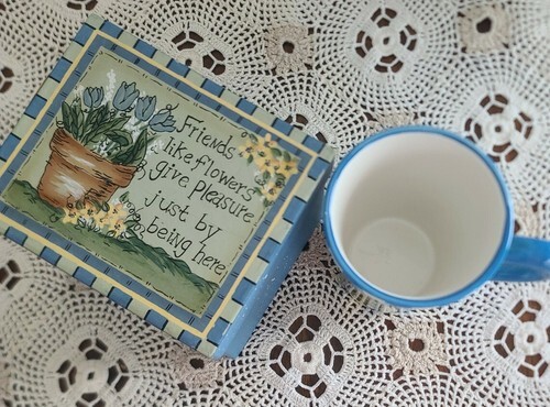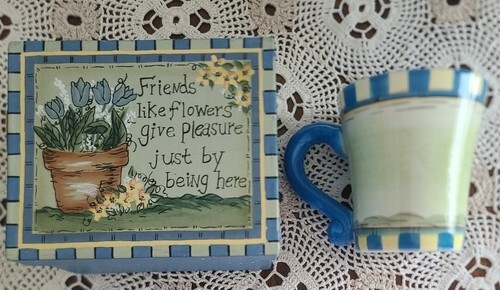 Mug says "Friends like flowers give pleasure just by being here"